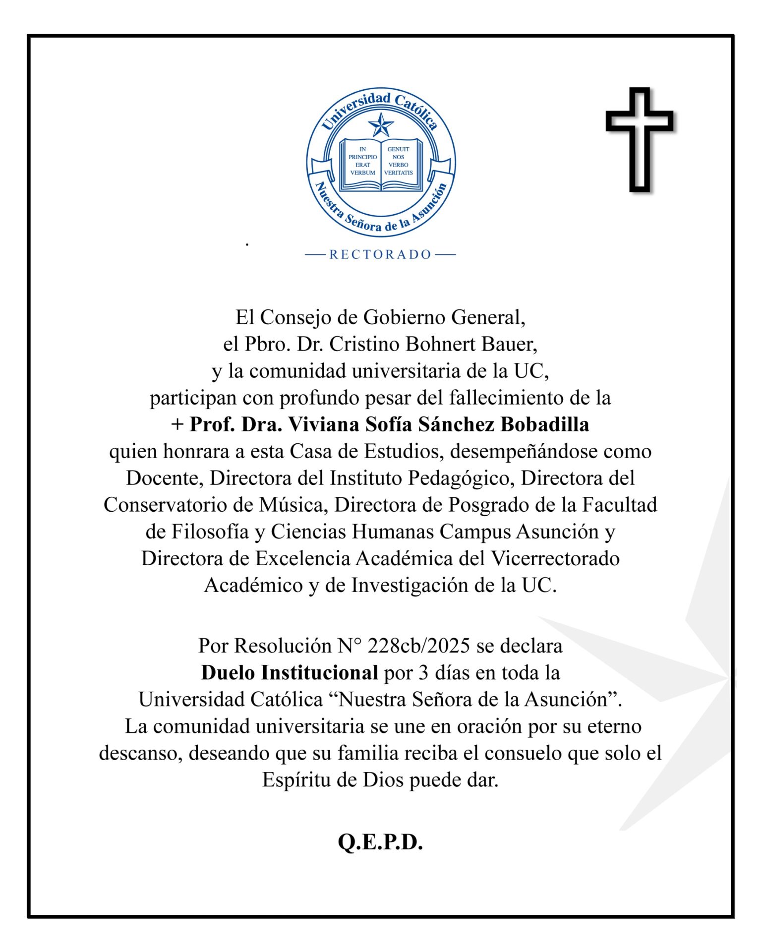 Se comunica a la Comunidad Universitaria de la UC, la declaración de duelo institucional por tres días, por las sentidas pérdidas de la Profesora Dra. Viviana Sánchez y el Prof. Carlos León Ayala.