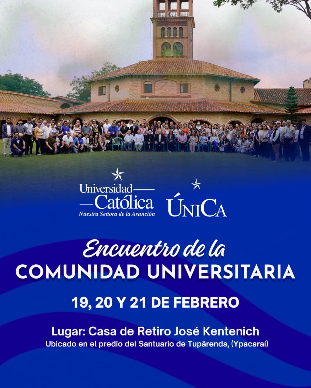 La Universidad Católica “Nuestra Señora de la Asunción” invita a participar del Encuentro de la Comunidad Universitaria UC. Dicha actividad se realizará en las fechas 19, 20 y 21 de febrero, en la Casa de Retiro José Kentenich ubicado en el predio del Santuario de Tupãrenda (Ypacaraí), iniciando a las 08:30h del día jueves 19 y finalizando el sábado 21 del corriente.