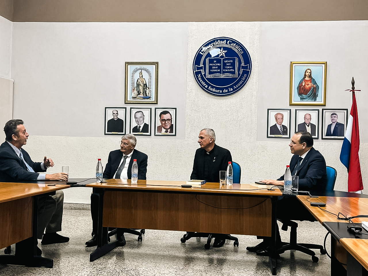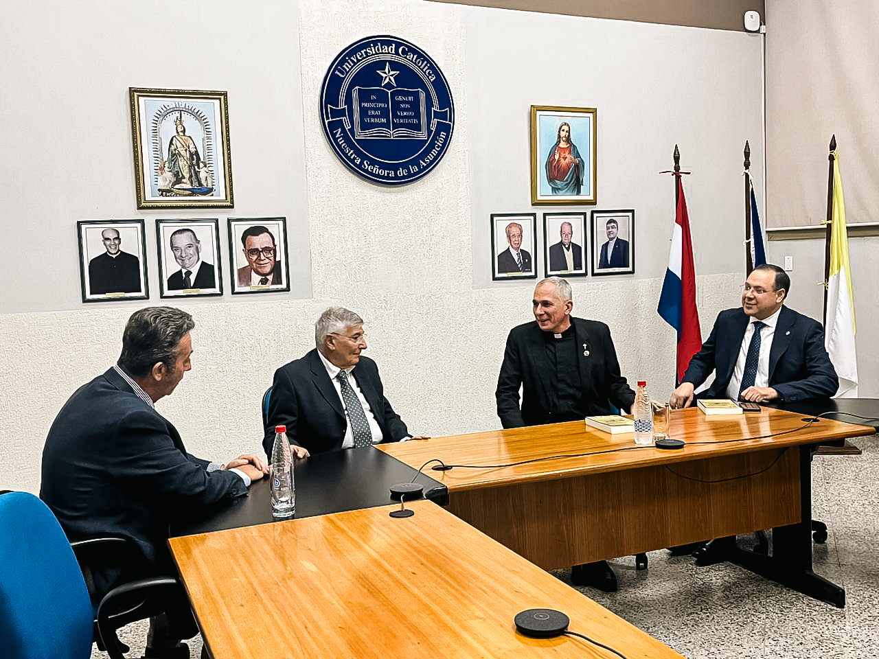 Previa a la charla, el catedrático italiano De Feo, quién por primera vez viene al país y el embajador Fondi tuvieron una reunión con el Rector de la Universidad, Pbro. Dr. Cristino Bohnnert donde se abordaron líneas de colaboración académica y cultural para ambas instituciones para luego participar del ciclo académico en compañía del Dr. Vallejos, quién actuó de traductor.