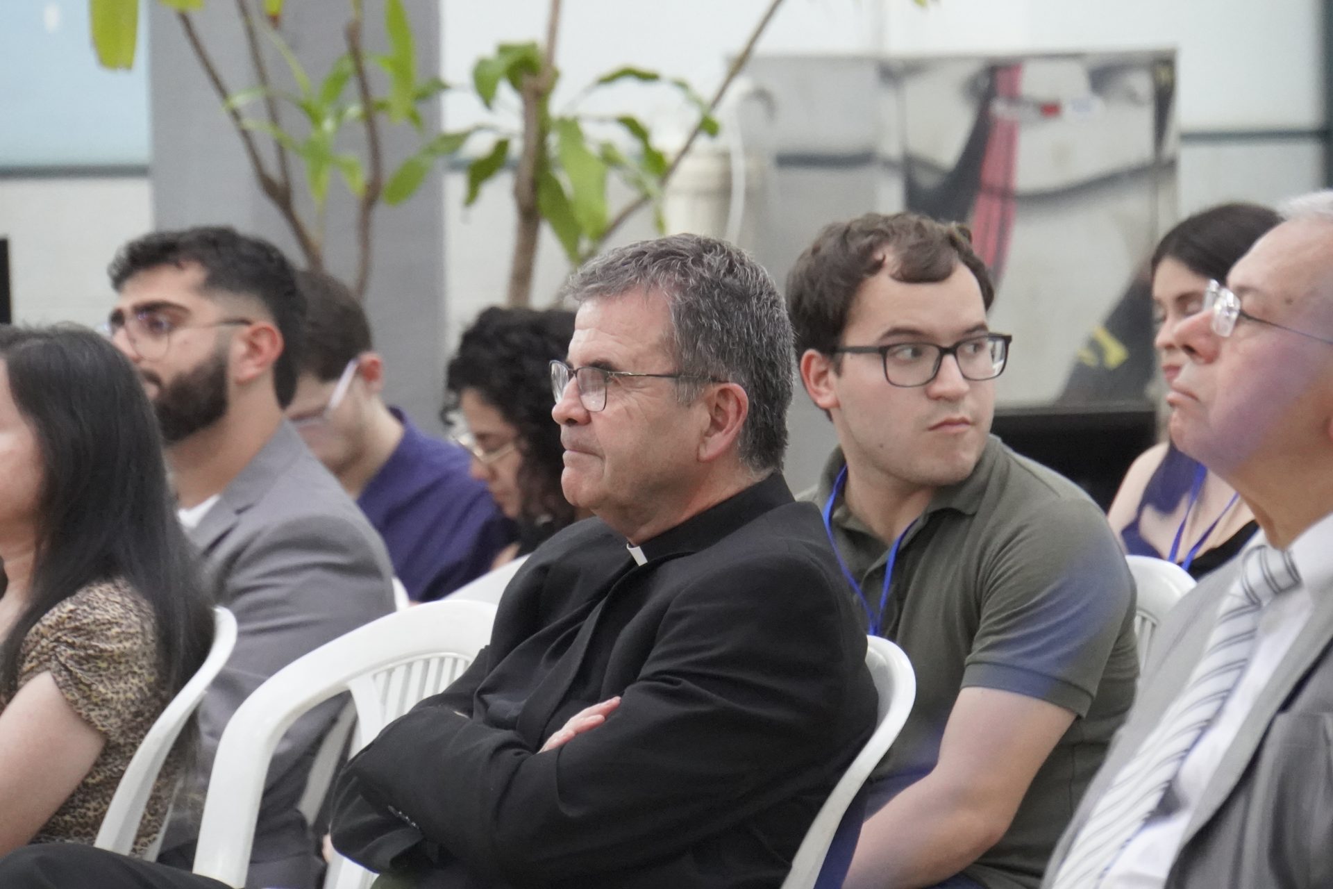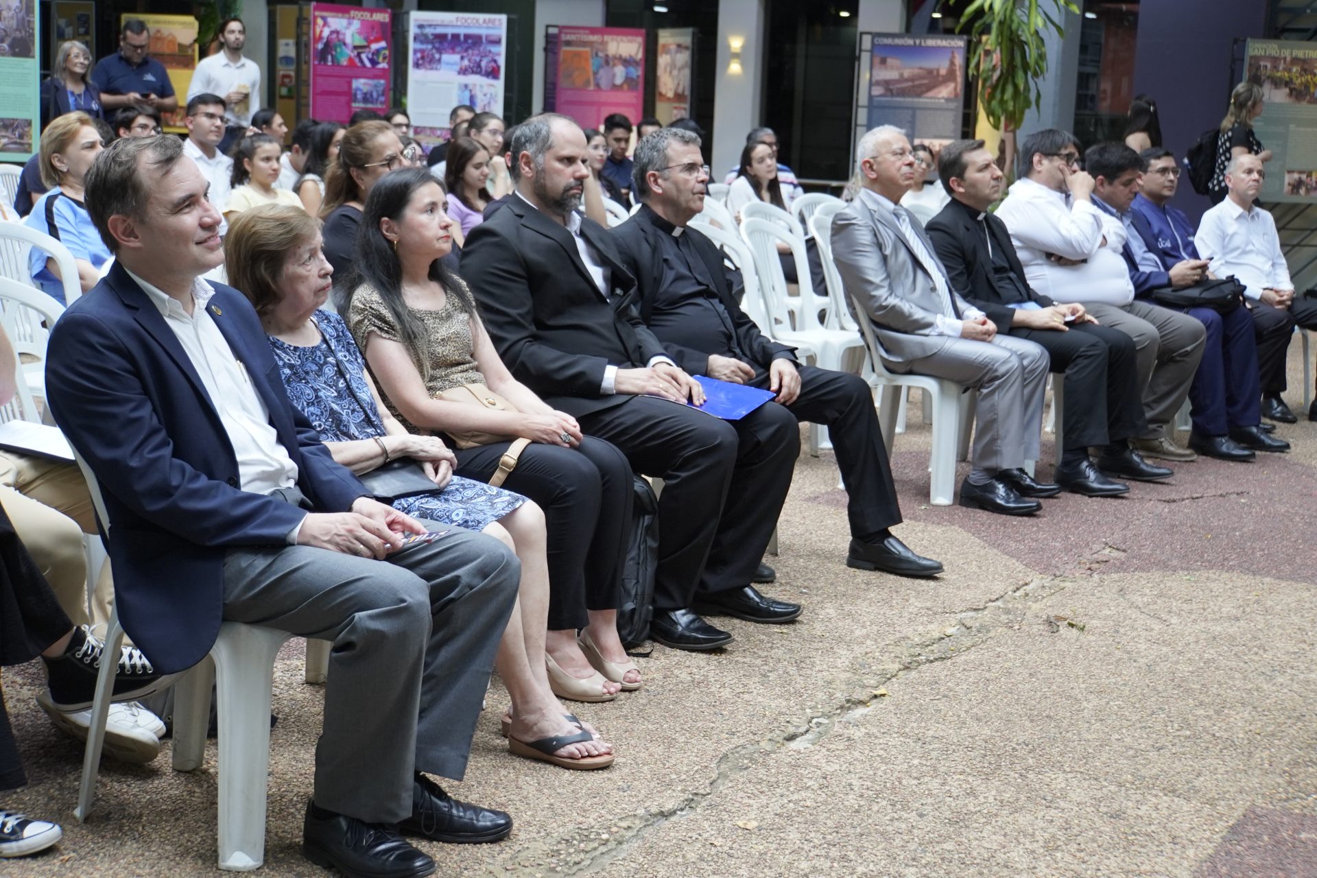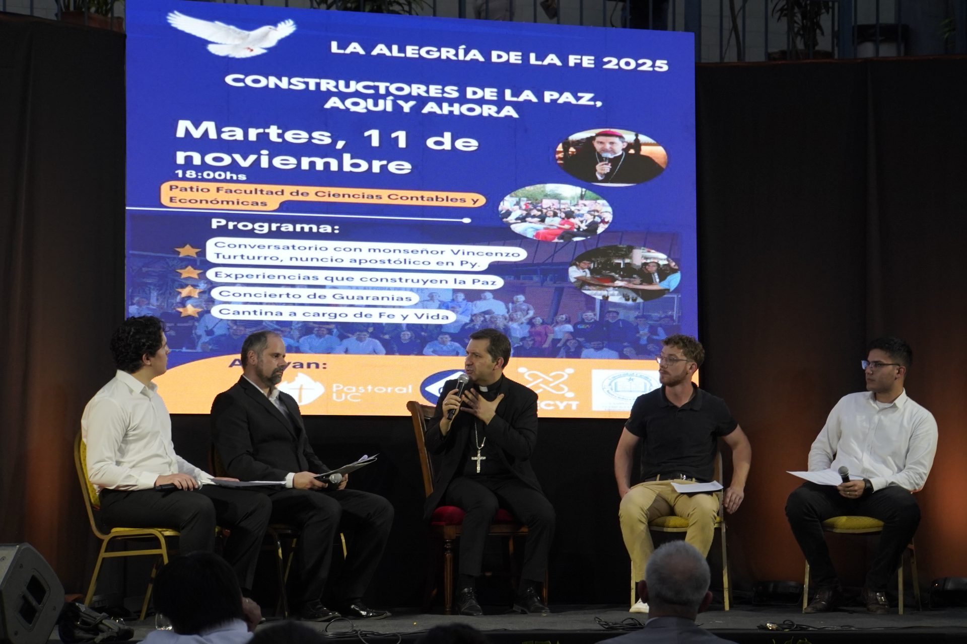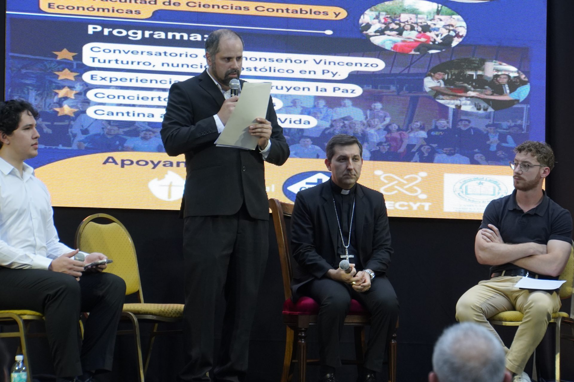 El evento tuvo como propósito fortalecer la vivencia de la fe dentro del ámbito académico, promoviendo valores cristianos que inspiran al servicio, a la fraternidad y al compromiso con el prójimo. Durante la jornada, una de las actividades centrales fue un conversatorio con el Excmo. y Rvdmo. Sr. Mons. Vincenzo Turturro, Nuncio Apostólico de la Santa Sede en Paraguay, quien compartió su experiencia diplomática y su visión sobre el papel de los jóvenes, la Iglesia y la sociedad. Durante el diálogo los participantes pudieron plantear preguntas, intercambiar ideas y reflexionar sobre los desafíos actuales desde la fe. El Mons. Turturro subrayó que “es lindo ver a los jóvenes comprometidos” y animó a que no se adopte una postura de indiferencia frente a la realidad, sino que los universitarios se involucren con responsabilidad, solidaridad y esperanza.