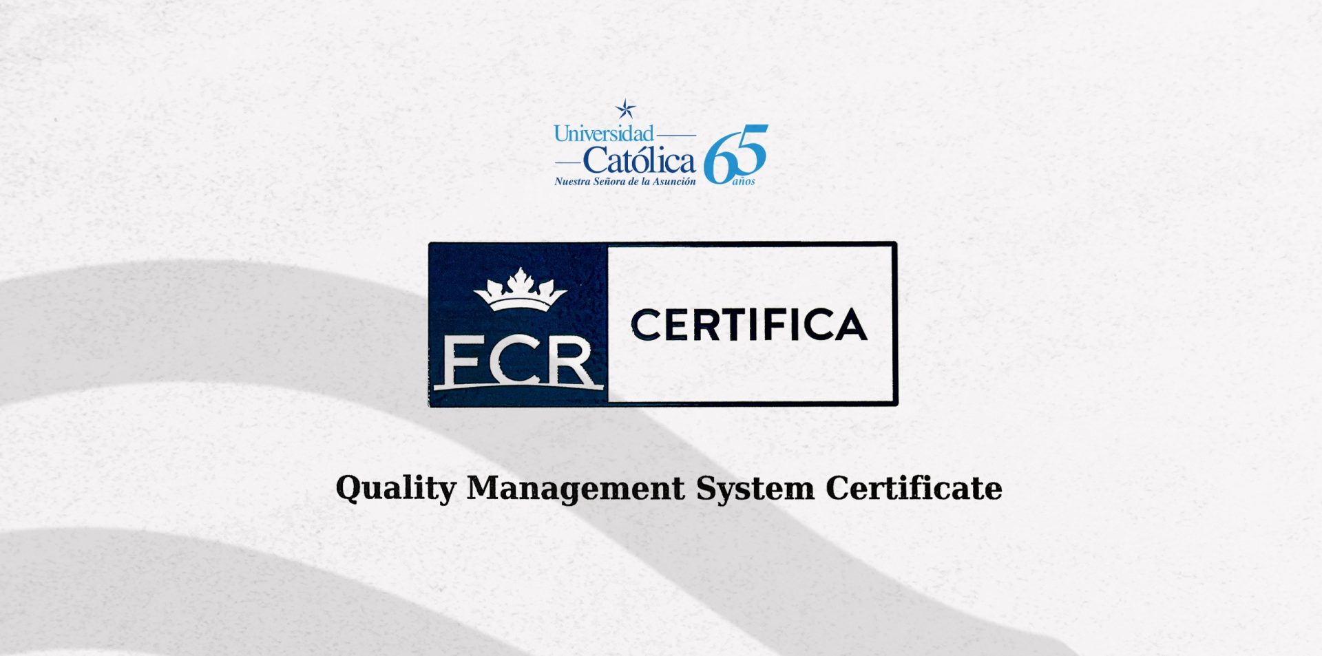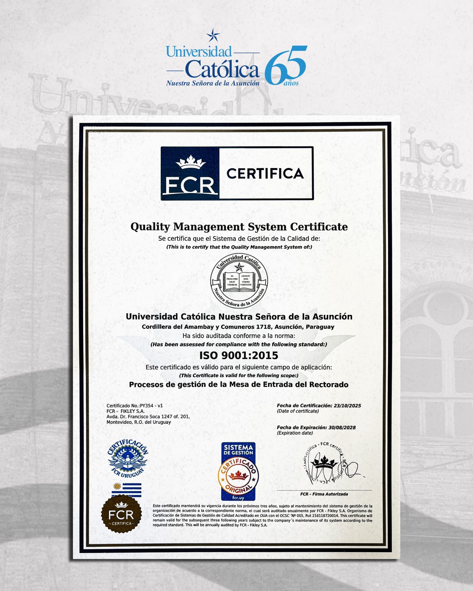 La Universidad Católica “Nuestra Señora de la Asunción” recibió oficialmente el Certificado Internacional de Sistema de Gestión de la Calidad ISO 9001:2015, otorgado por la firma certificadora FCR Certifica, como resultado de la auditoría externa realizada a los procesos de gestión de la Mesa de Entrada del Rectorado.