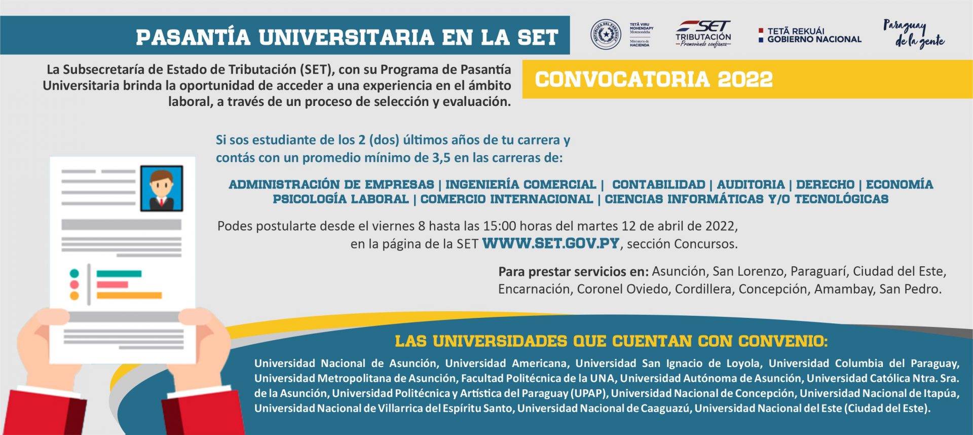 La Universidad Católica «Nuestra Señora de la Asunción» invita a sus estudiantes a participar de la Convocatoria a Concurso de Pasantía Universitaria 2022 de la Subsecretaría de Estado de Tributación- SET. Dirigido a estudiantes de los dos últimos años, con promedio de 3,5, de las carreras de Administración de Empresas; Contabilidad, Derecho, Economía, Psicología Laboral, Comercio Internacional, Ciencias Informáticas y/o Tecnologías.