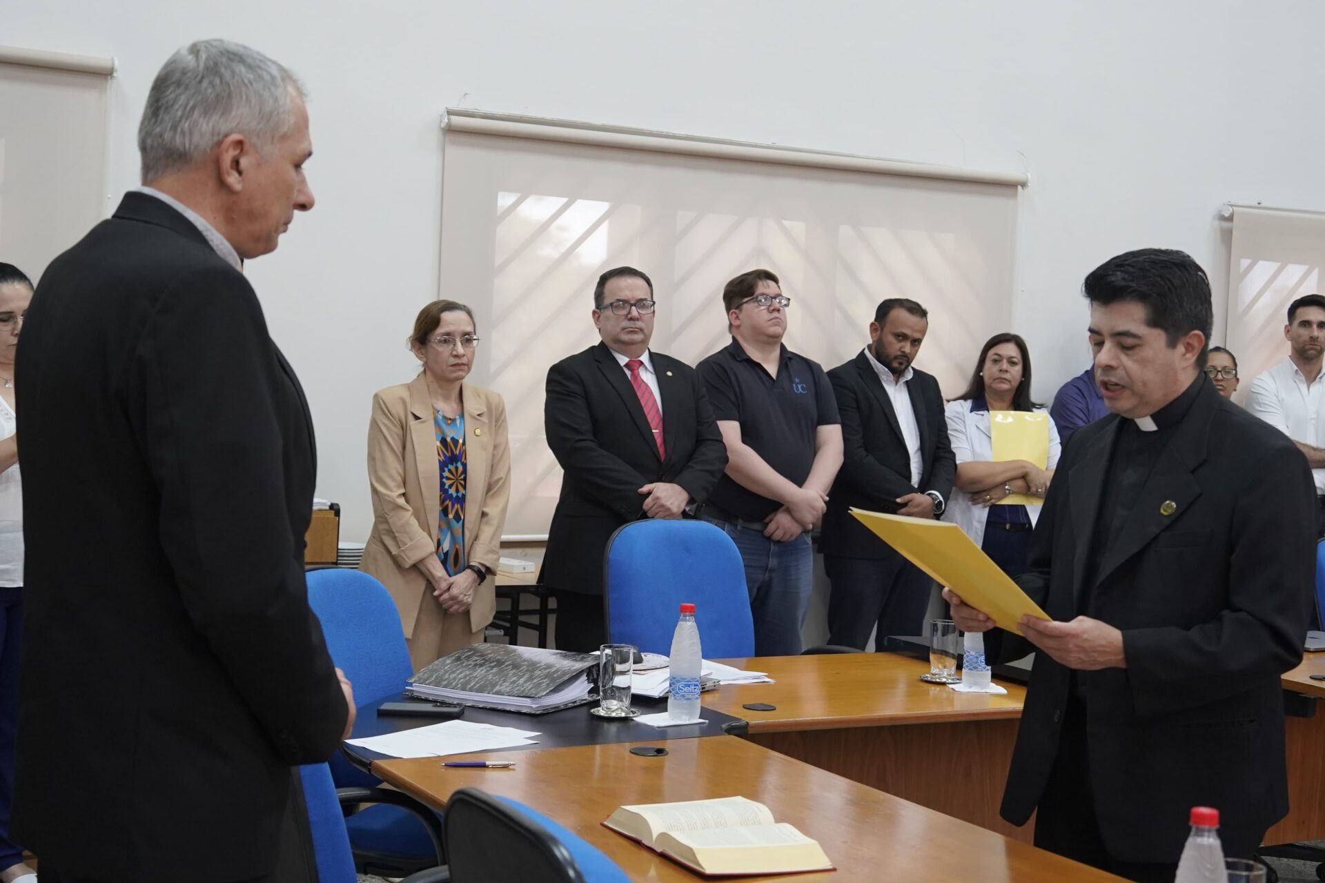 En la mañana de este martes, en la sala de sesiones del Rectorado – Campus Asunción, se llevó a cabo el acto de juramento del Pbro. Mg. Sergio Ayala Viveros como nuevo secretario general de la Universidad Católica “Nuestra Señora de la Asunción”, para el quinquenio 2025–2030. El mismo se venía desempeñando como consejero asesor de la Universidad, cargo del cual se desprende para asumir esta nueva responsabilidad. La elección de su reemplazo como consejero será tratada por la CEP.