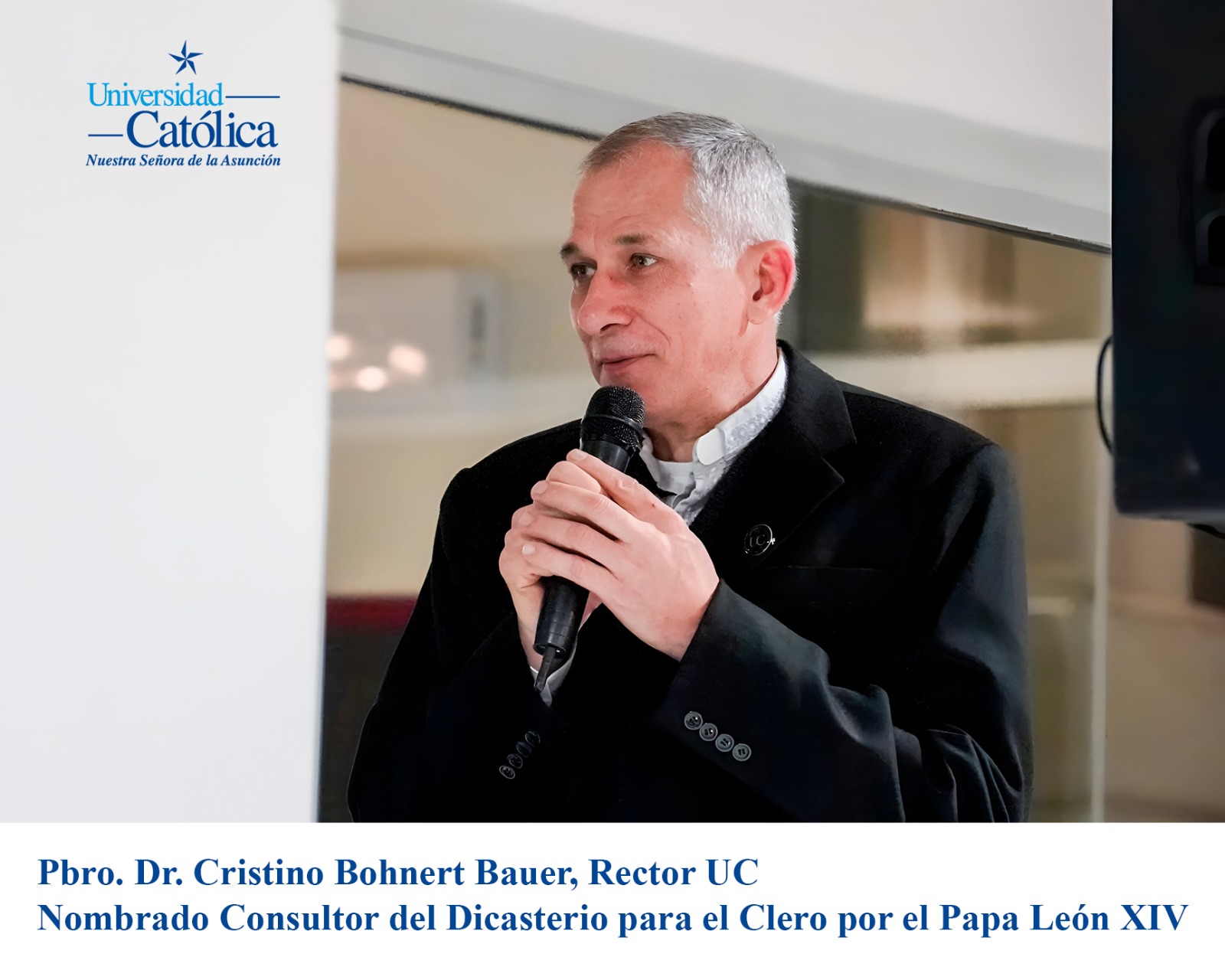 La Comunidad de la Universidad Católica “Nuestra Señora de la Asunción” celebra con júbilo el nombramiento del Pbro. Dr. Cristino Bohnert Bauer, Rector de la UC, como Consultor del Dicasterio para el Clero, designación realizada por Su Santidad el Papa León XIV.