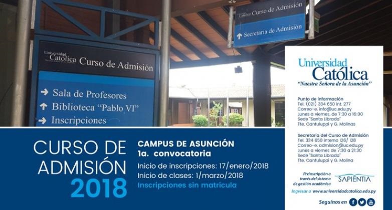 Están abiertas las preinscripciones al Curso de Admisión 2018 del Campus de Asunción a través de la plataforma Sapientia de acceso en línea. Así, lo anunció la Secretaría de Admisión que organiza el inicio del año lectivo en marzo del próximo año.
