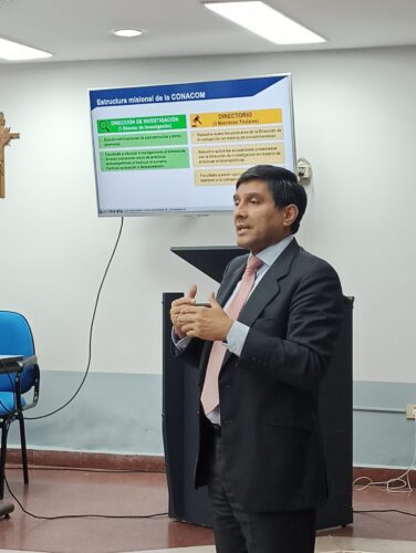 Ante un Aula Magna con importante asistencia de estudiantes de Ciencias Jurídicas, docentes, egresados y público invitado, el Abg. Rolando Díaz Delgado, miembro del Directorio de la CONACOM desarrolló una bastante clara y didáctica presentación acerca de la institución que representa, las funciones de la misma, su estructura misional, así como también presentó ejemplos concretos de actuaciones en el marco del doble rol institucional de la promoción y la defensa de la competencia.