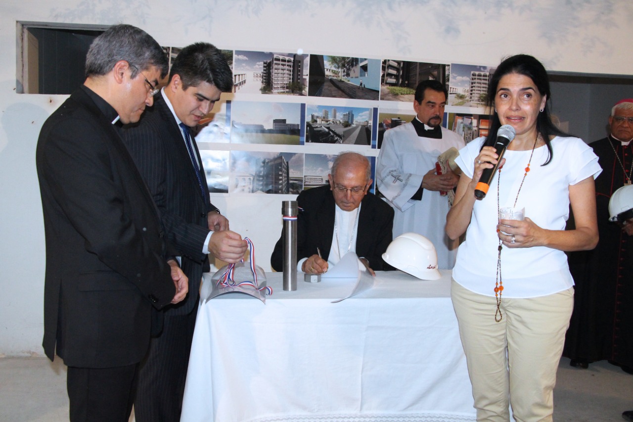 Las palabras de inicio estuvieron a cargo del Rector de la UC, Pbro. Dr. Narciso Velázquez. Seguidamente, Mons. Edmundo Valenzuela, Gran Canciller de la Universidad, realizó la bendición y prosiguió con la firma del Acta de Instauración y asentamiento de la piedra fundamental, que fue colocado dentro de la cápsula del tiempo junto con varias monedas locales de circulación actual y el bolígrafo con el cual fue firmada el acta. La cápsula, a su vez, fue puesta en el sitio de la piedra fundamental por la decana de la Facultad de Filosofía, Lic. Stella Marys Olmedo.