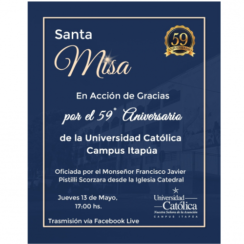 Se invita a la Comunidad Educativa a participar de la SANTA MISA en acción de gracias por el 59° aniversario de la UC Itapúa, presidida por el Monseñor Francisco Javier Pistilli Scorzara, Obispo de la Diócesis de Encarnación, el día jueves 13 de mayo, a las 17:00 vía Facebook Live, desde la Iglesia Catedral.