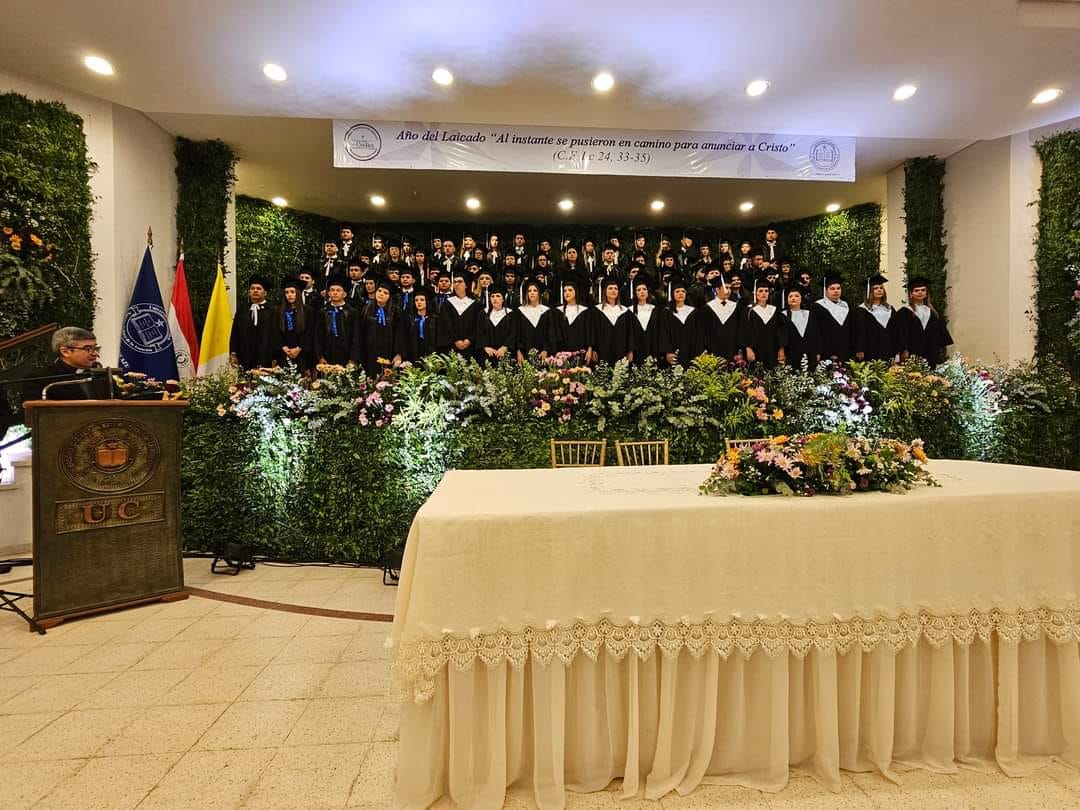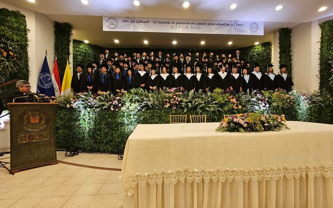 La Universidad Católica Campus Caaguazú celebró la graduación de la promoción 2024 denominada Año del Laicado “Al instante se pusieron en camino para anunciar a Cristo” (Cf. Lc. 24, 33-35) , reconociendo a los egresados de las carreras de Medicina Veterinaria, Ingeniería Agronómica, Arquitectura, Administración de Empresas, Derecho y Psicología, además de los posgrados en Especialización en Docencia de la Educación Superior, Especialización en Metodología de la Investigación Científica y Maestría en Metodología de la Investigación Científica.