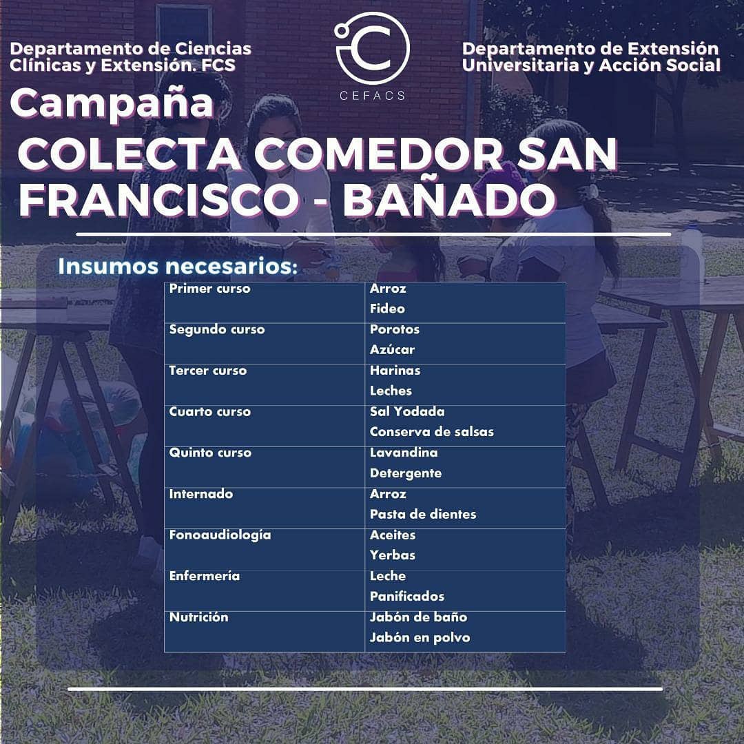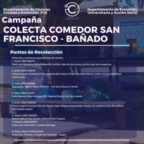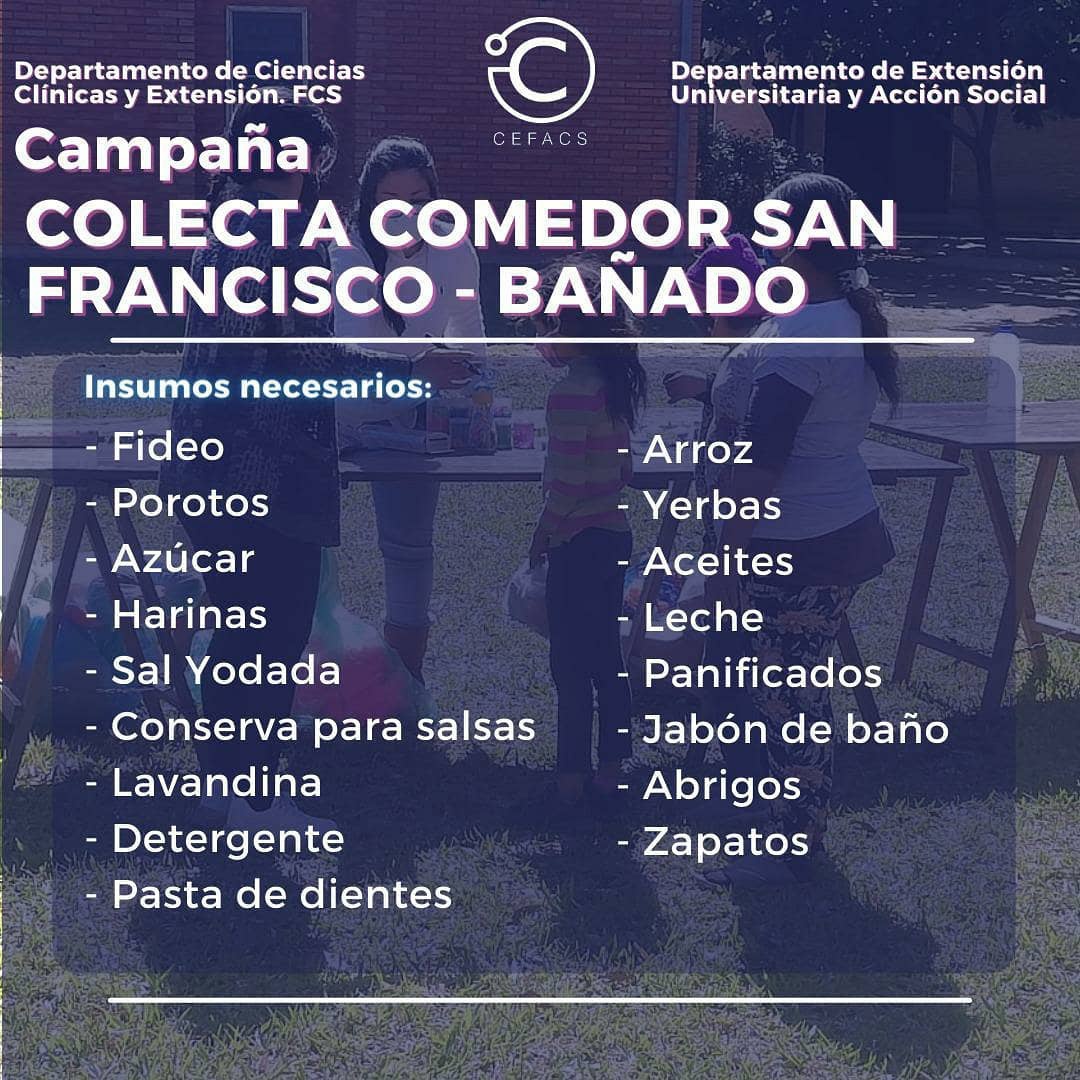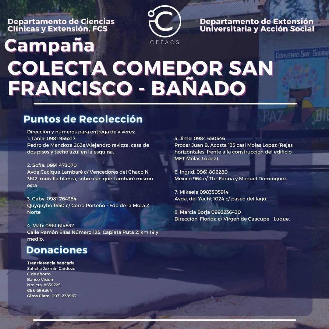 Acorde a los valores éticos y cristianos promovidos por la Universidad Católica «Nuestra Señora de la Asunción», en su misión de contribuir a una sociedad justa, solidaria, incluyente, sostenible y respetuosa de la dignidad humana, desde el Centro de Estudiantes de la Facultad de Ciencias de la Salud- CEFACS, están promoviendo la Campaña «Colecta Comedor San Francisco- Bañado», con el objetivo de llevar alimentos a aquellas personas que se encuentran atravesando momentos difíciles ante esta crisis sanitaria. Entre los insumos necesarios citan; fideos, arroz, porotos, azúcar, sal yodada, conserva para salsas, aceites, yerba, leche, panificados, lavandina, detergente, jabón de baño, abrigos y zapatos.