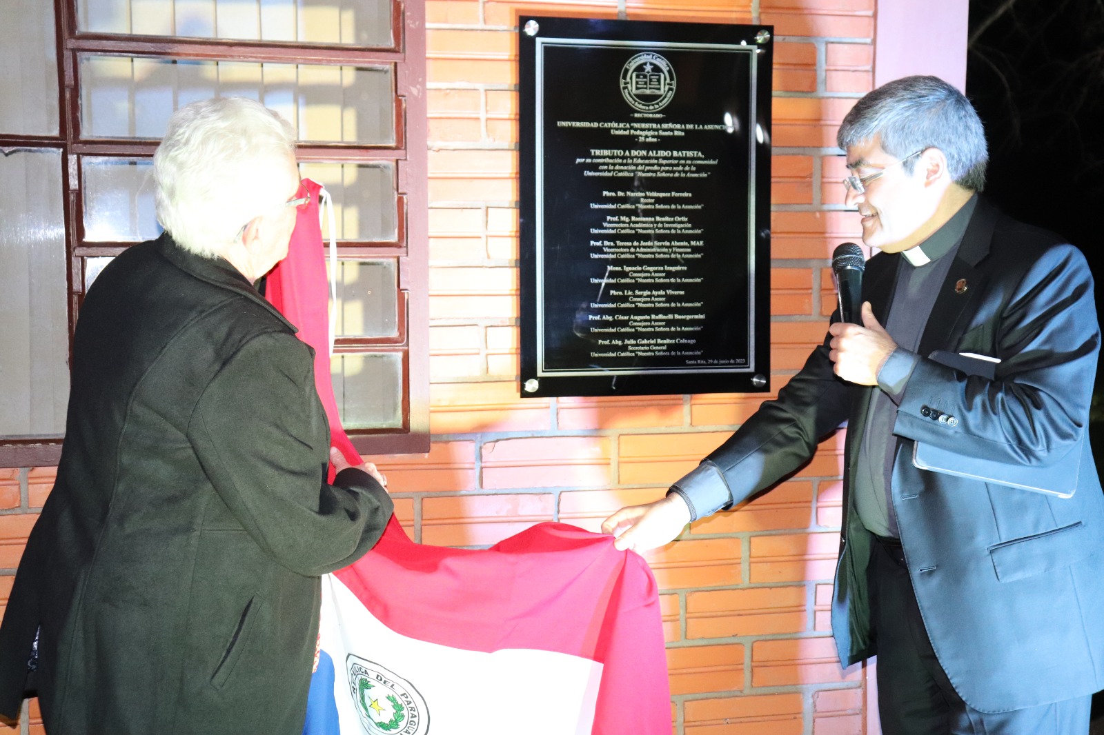 La noche finalizó con el descubrimiento de la placa en tributo a Don Alido Batista, por su contribución a la educación superior con la donación del predio para la sede de la Unidad Pedagógica Santa Rita.