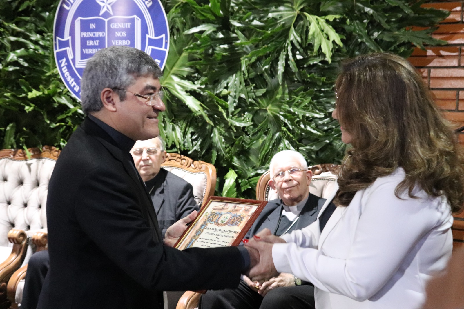 Para luego trasladarse a la sede de la Unidad Pedagógica Santa Rita, en la distinguida ceremonia la casa de estudios recibió el reconocimiento de la Junta Municipal de la ciudad por los 25 años de apertura, siendo la primera institución de educación superior en Santa Rita, y los deseos de seguir cosechando éxitos y educación de excelencia. El reconocimento lo entregó la Abog. Marina Cuéllar, presidenta de la Junta Municipal, egresada y ex docente de la UC.