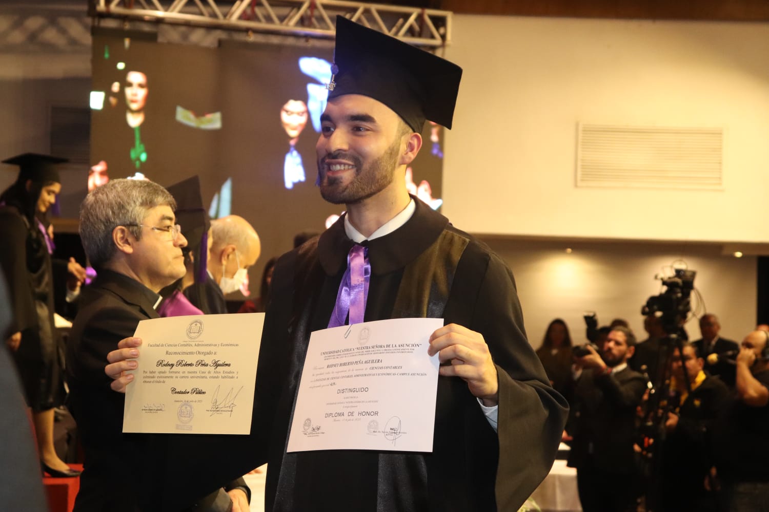 Padres de familia, amigos, autoridades, docentes y padrinos de promoción acompañaron a los jóvenes profesionales y fueron testigos de la emoción en sus rostros al recibir su diploma de graduación, símbolo del esfuerzo, entrega y dedicación puesta a lo largo de los años de estudio para hacerse de un título con respeto en la Universidad Católica «Nuestra Señora de la Asunción».