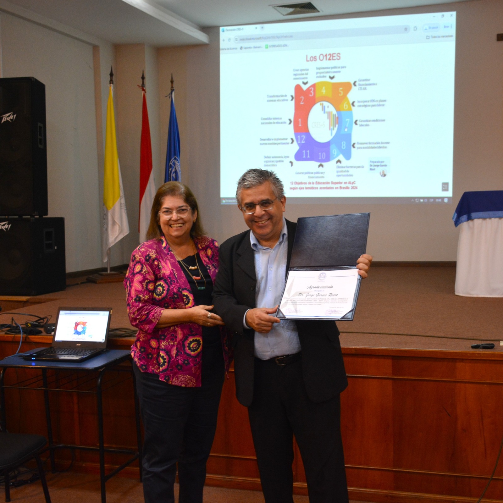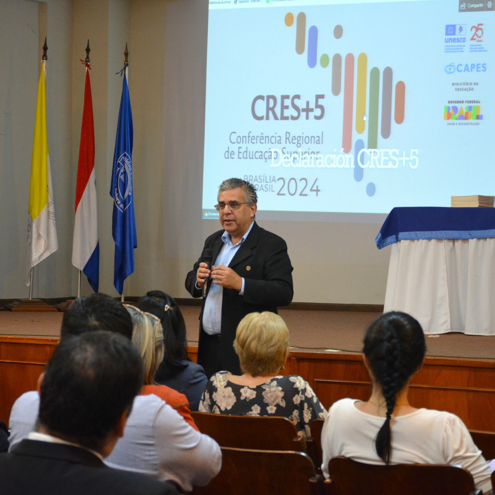 En un evento declarado de interés institucional por el Consejo Nacional de Educación y Ciencia, se llevó a cabo la charla «Educación Superior, una mirada integral a través de las conclusiones CRES – 2024», en la sede del Campus Universitario Alto Paraná. El Dr. Jorge García Riart fue el encargado de brindar una disertación sobre el tema, resaltando el papel crucial que desempeña la educación superior en la formación de profesionales y en la transformación de la sociedad.