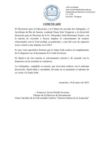 El Dicasterio para la Educación y la Cultura ha enviado dos delegados, el Arzobispo de Río de Janeiro, cardenal Orani João Tempesta y el oficial del dicasterio para la Doctrina de la Fe, Monseñor Jordi Bertomeu Farnós, con la misión de escuchar y buscar ampliar el conocimiento de asuntos relacionados con la Universidad, en particular, a raíz del caso de supuesto acoso sexual a una alumna en el 2014.