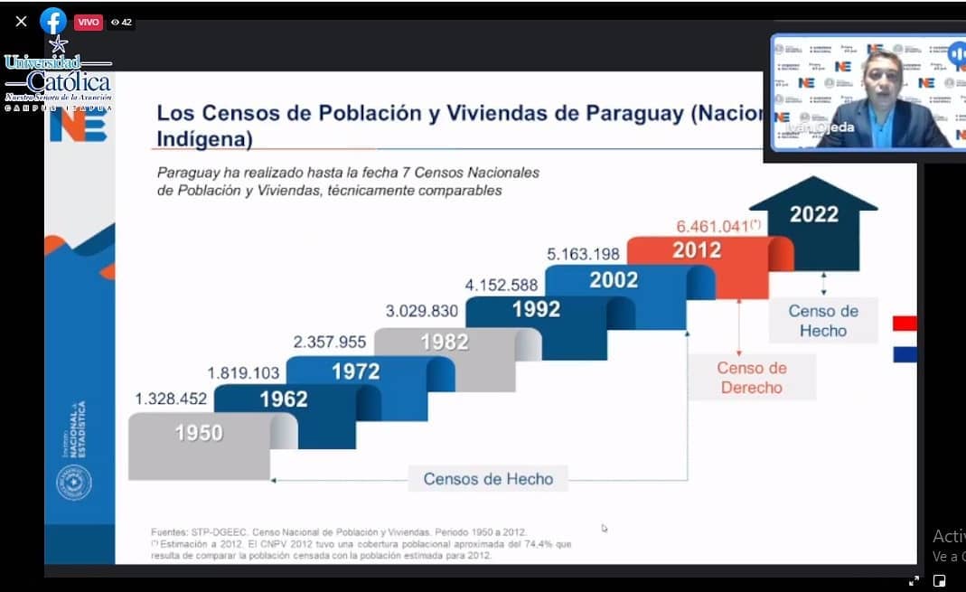 En la Universidad Católica Campus Itapúa se desarrolló la conferencia virtual sobre Censo de Población y Vivienda Paraguay 2022, dirigida por el Lic. Iván Mauricio Ojeda Aguilera, director del Instituto Nacional de Estadística. El lunes 26 de julio se realizó el evento organizado en el marco de la Especialización en Estadística Aplicada de la Facultad de Ciencias Económicas, a través medios telemáticos de comunicación y se trasmitió en directo en Facebook Live de la UC Itapúa.