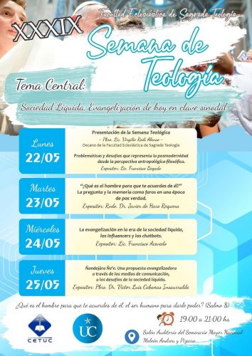 Dirigida a laicos, sacerdotes, diáconos, religiosos/as, profesores, alumnos, grupos parroquiales y movimientos laicales, continúan los seminarios en el marco de la XXXIX Semana de Teología organizada por la Facultad Eclesiástica de Sagrada Teología de la Universidad Católica “Nuestra Señora de la Asunción” .