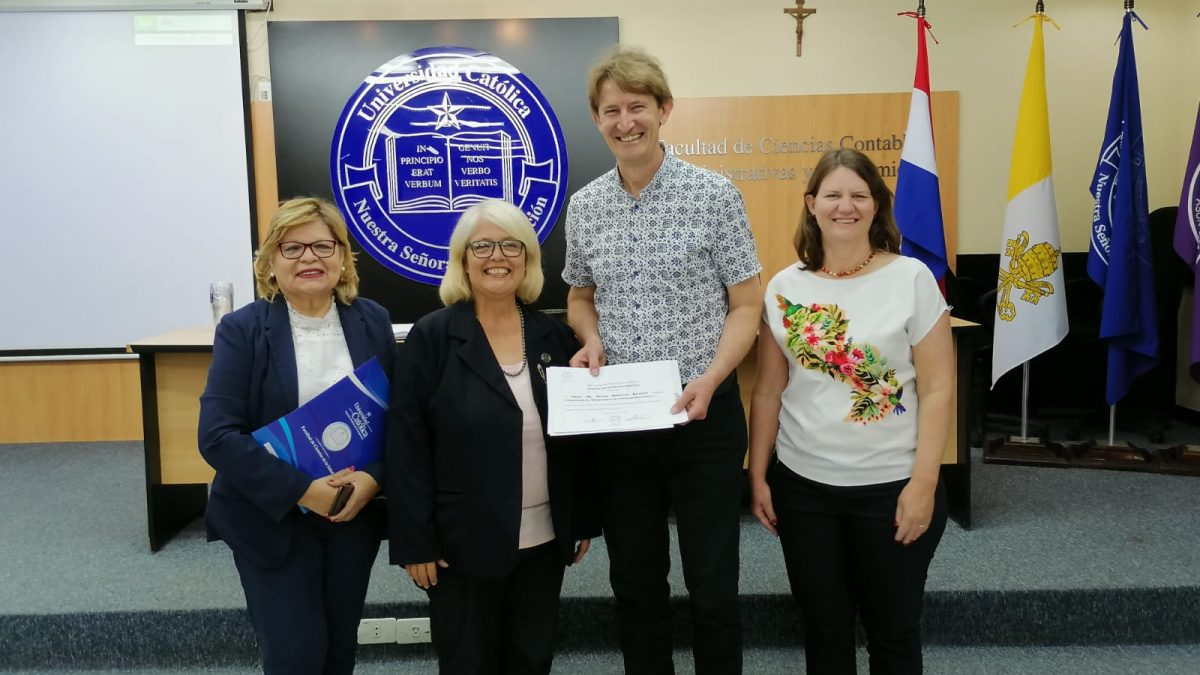 En ocasión de su estancia en Paraguay en compañía de su esposa Endelgard de Klassen se desarrolló una agenda de actividades en un marco de mucha productividad y camaradería; entrevistas con directivos de la FCS UC Campus Asunción, reuniones con estudiantes postulantes al intercambio con Alemania en el año 2023, homenaje y entrega de reconocimiento por su constante apoyo por parte del Consejo de Facultad de la FCS UC Asunción.