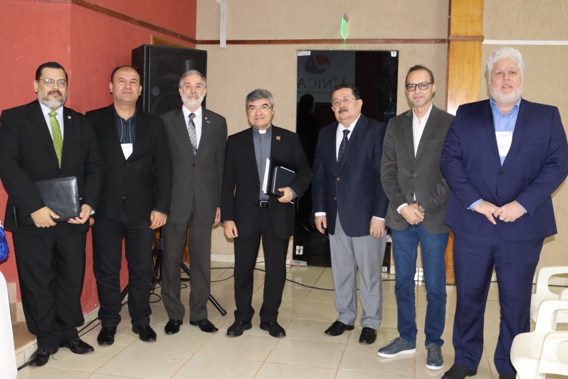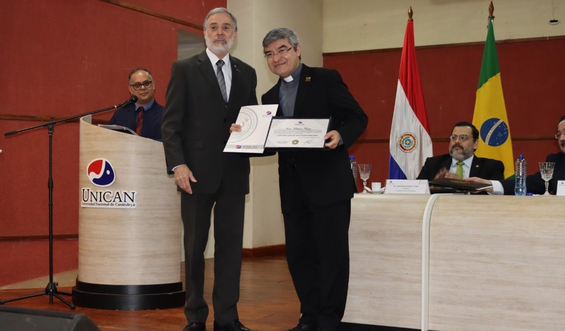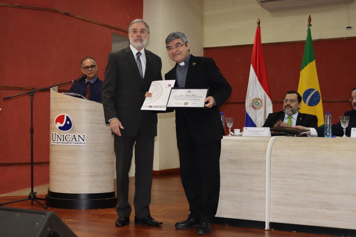 Firmaron el acuerdo de cooperación, por la Universidad Católica, el Rector Pbro. Dr. Narciso Velázquez Ferreira y por la Universidad Nacional de Canindeyú, su Rector Dr. Mariano Adolfo Pacher.