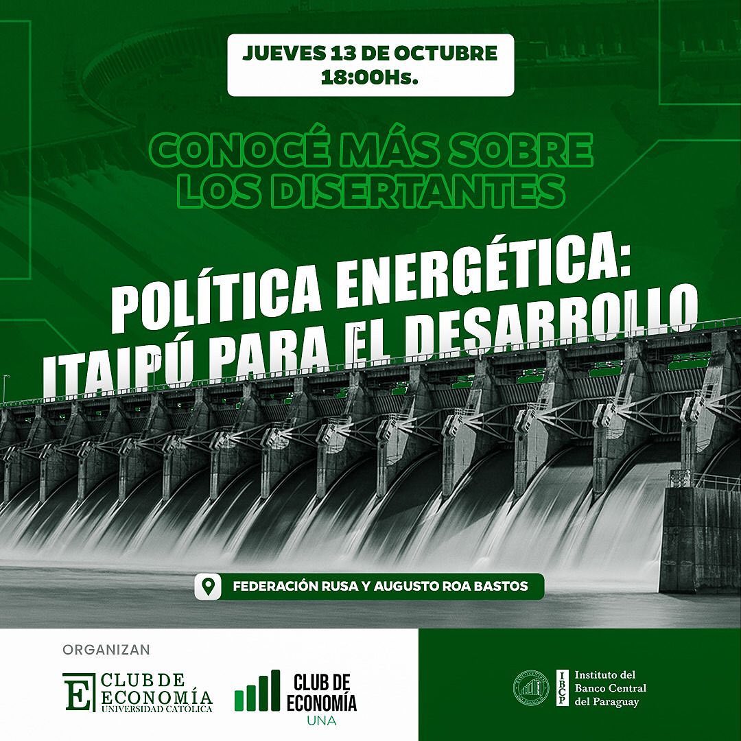 El Club de Economía de la Universidad Católica en conjunto con el Club de Economía de la Universidad Nacional de Asunción organizaron el Conversatorio sobre Política Energética denominado “Itaipú para el desarrollo” con la participación del Dr. James Spalding Hellmers, Ing. Ángel Recalde y el Ing. Daniel Ríos Festner. El encuentro se realizó el jueves 13 de octubre en el Auditorio del Instituto del Banco Central del Paraguay y fue trasmitido a través del Facebook Live 👉 En Directo.