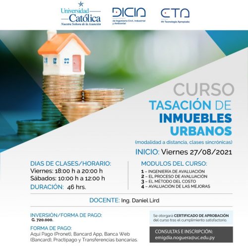El viernes 27 de agosto se dará inicio al curso de Tasación de Inmuebles Urbanos, promovido por el Departamento de Ingeniería Civil, Industrial y Ambiental y el Centro de Tecnología Apropiada de la UC Campus Asunción, a desarrollarse en la modalidad virtual con clases sincrónicas a través del uso de herramientas digitales de enseñanza. Como facilitador del curso estará el Ing. Daniel Lird.