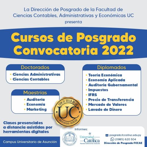 En la Universidad Católica «Nuestra Señora de la Asunción» estamos comprometidos con la formación continúa de los estudiantes, aportando un alto valor académico que ayuden a mejorar las competencias profesionales y le permitan desempeñarse con éxito en el mercado laboral. Para el presente, la Dirección de Posgrado de la Facultad de Ciencias Contables, Administrativas y Económicas del Campus Universitario Asunción habilitó doce programas de estudios.