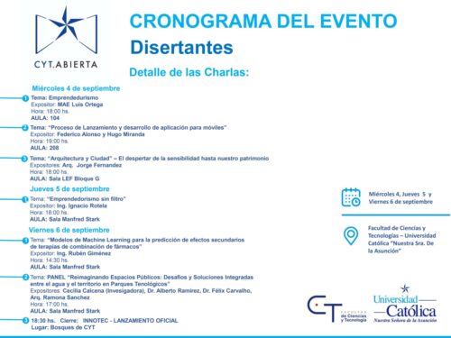 El evento CyT Abierta, organizado por la Facultad de Ciencias y Tecnología de la Universidad Católica Campus Asunción, se encuentra en pleno desarrollo, ofreciendo una plataforma de intercambio de conocimientos y experiencias entre estudiantes y destacados profesionales. Durante esta semana, se llevan a cabo charlas magistrales dirigidas a todas las carreras de la facultad; Arquitectura, Diseño Gráfico e Industrial, y las ingenierías Civil, Ambiental, Informática, Electrónica e Industrial. Asimismo, tendrá lugar la exposición de trabajos de estudiantes de Arquitectura, Diseño Gráfico e Industrial, en el patio techado de la facultad.