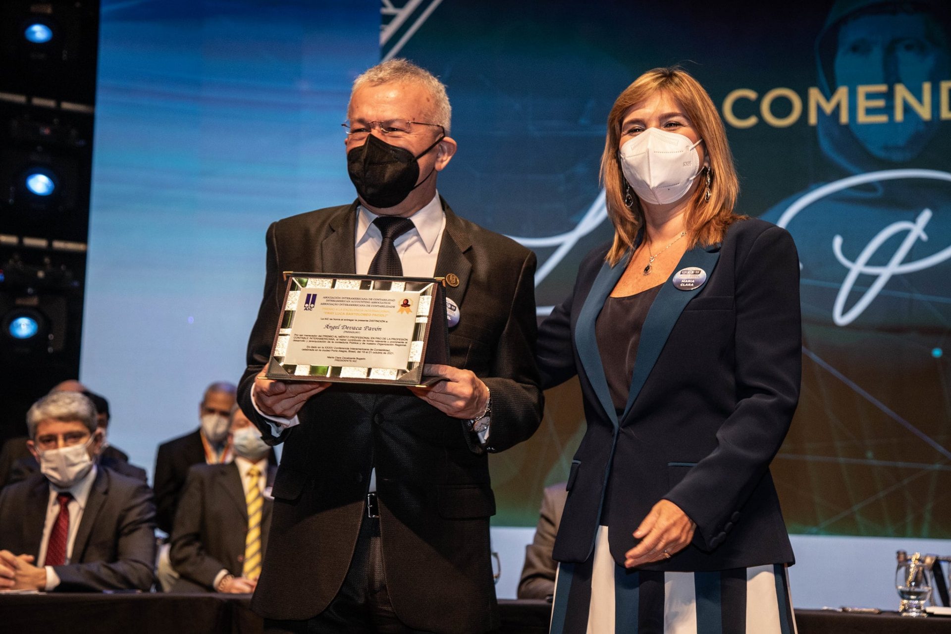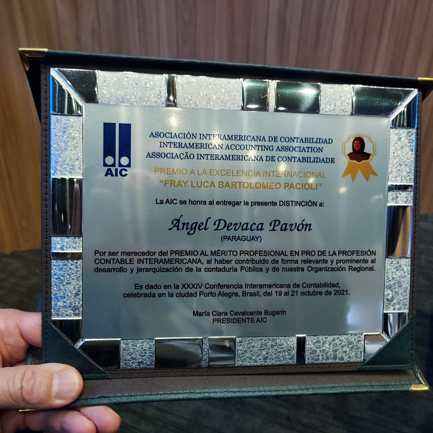 El Dr. Ángel Devaca Pavón, decano de la Facultad de Ciencias Contables, Administrativas y Económicas del Campus Asunción fue distinguido por la Asociación Interamericana de Contabilidad (AIC) con el “Premio a la Excelencia Internacional Fray Luca Bartolomeo Paccioli” , reconocimiento al mérito profesional, en virtud al destacado aporte en pro de la profesión contable Interamericana de la Asociación Interamericana de Contabilidad, durante la Ceremonia de Apertura de la XXXIV Conferencia Interamericana de Contabilidad.