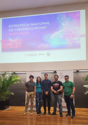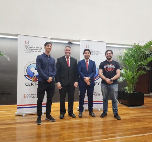 La Dirección General de Informática estuvo presente en el Lanzamiento de la Estrategia Nacional de Ciberseguridad de Paraguay. En la foto (Izq. a derecha) Coordinador de la DGI UC Sebastián Mederos, junto a Jorge Andrés Levera Gómez, Director General de Ciberseguridad y Protección a la Información, y Coordinador Nacional de Ciberseguridad, Orlando Garces Oficial de Políticas de Ciberseguridad dentro de la Comisión Interamericana Contra el Terrorismo (CICTE) de la Organización de Estados Americanos (OEA), y Adrián Amarilla integrante del departamento de Infraestructura de la DGI.