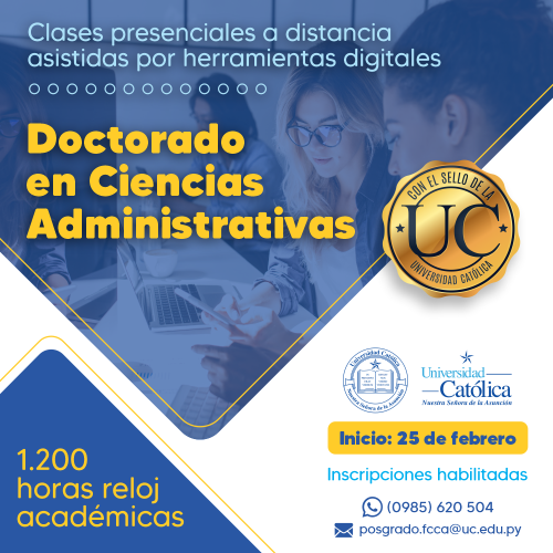 La Dirección de Posgrado de la Facultad de Ciencias Contables, Administrativas y Económicas del Campus Universitario de Asunción, lanzó la convocatoria de inicio de su curso de Doctorado en Ciencias Administrativas, que será desarrollado a través del uso de herramientas digitales de enseñanza y se iniciará el próximo viernes 25 de febrero. Las inscripciones ya se encuentran habilitadas.