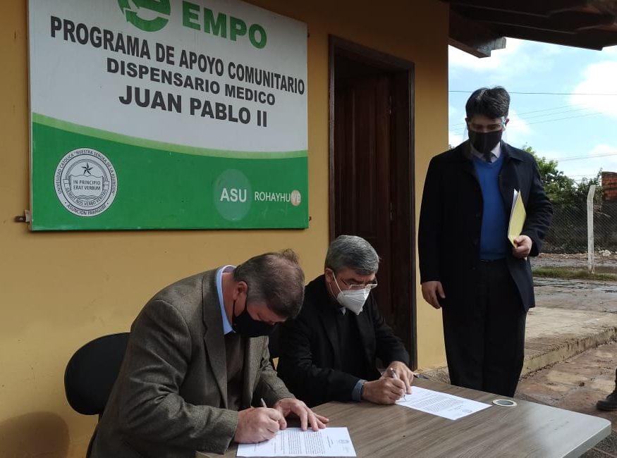 A 12 años de funcionamiento del dispensario médico “Juan Pablo II” ubicado en el vertedero “Cateura” del Bañado Sur, la Universidad Católica por medio de sus profesionales médicos, docentes y estudiantes, afianza con firmeza la atención de calidad brindada de manera ininterrumpida, y renueva el compromiso con la comunidad de la zona, recibiendo en calidad de donación de parte de la empresa EMPO Ltda., todas las instalaciones, construcciones y mobiliarios que componen e integran el Dispensario Médico.