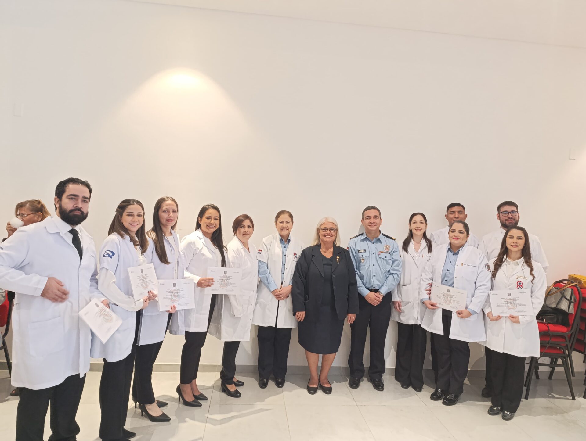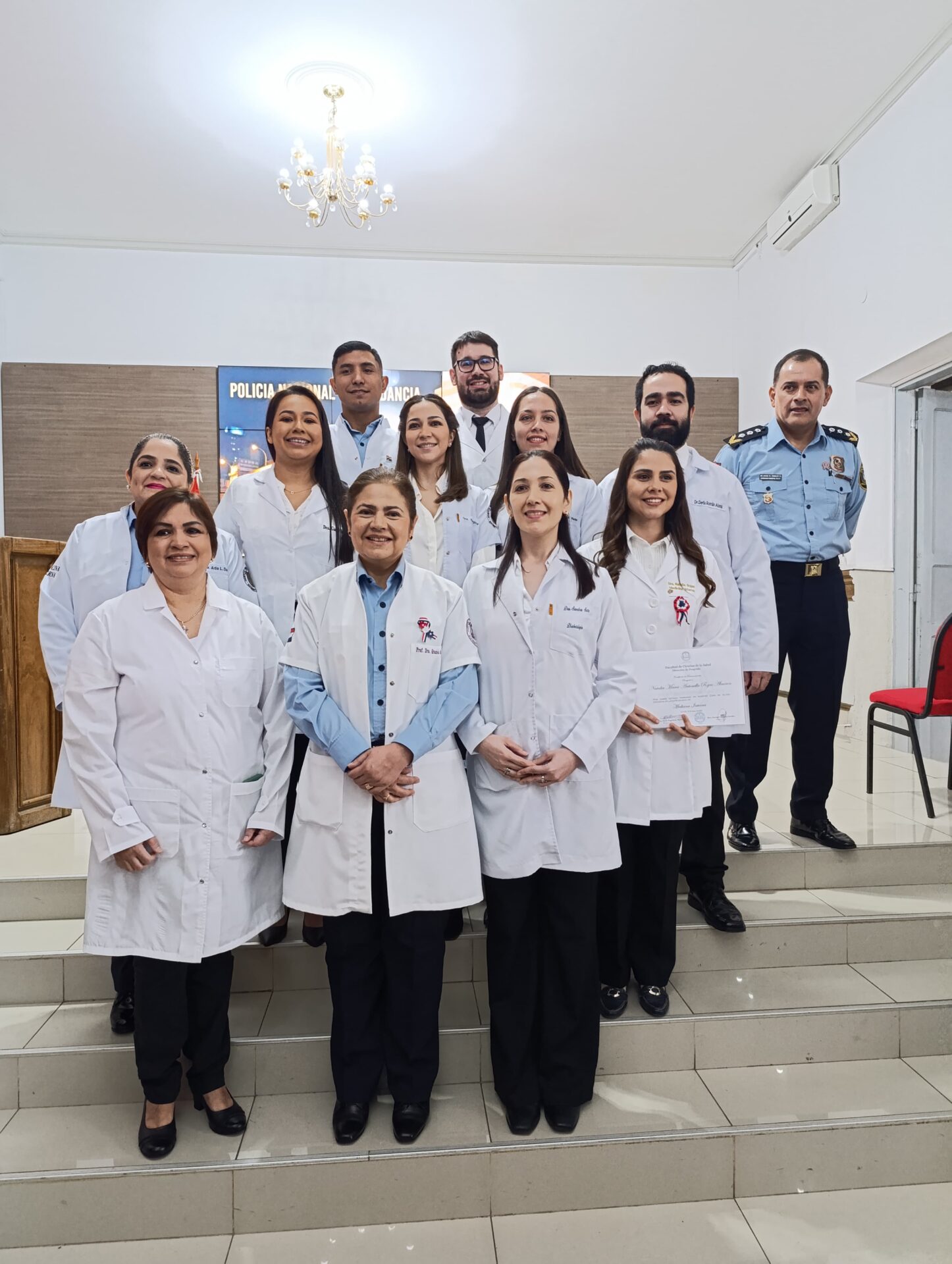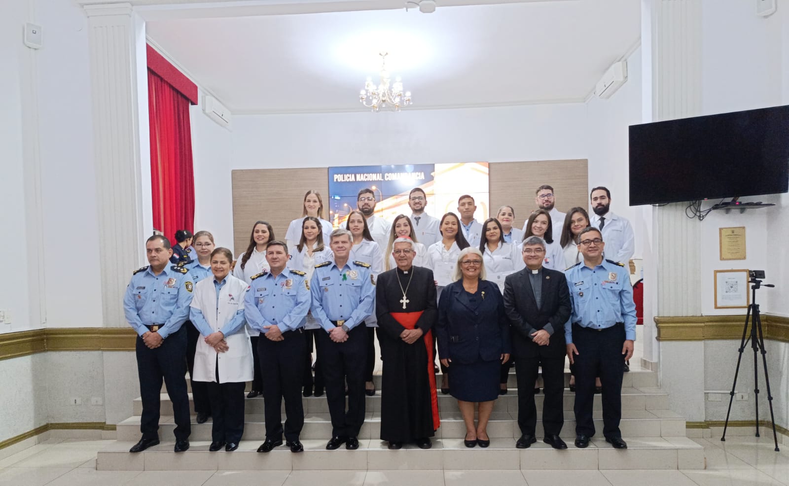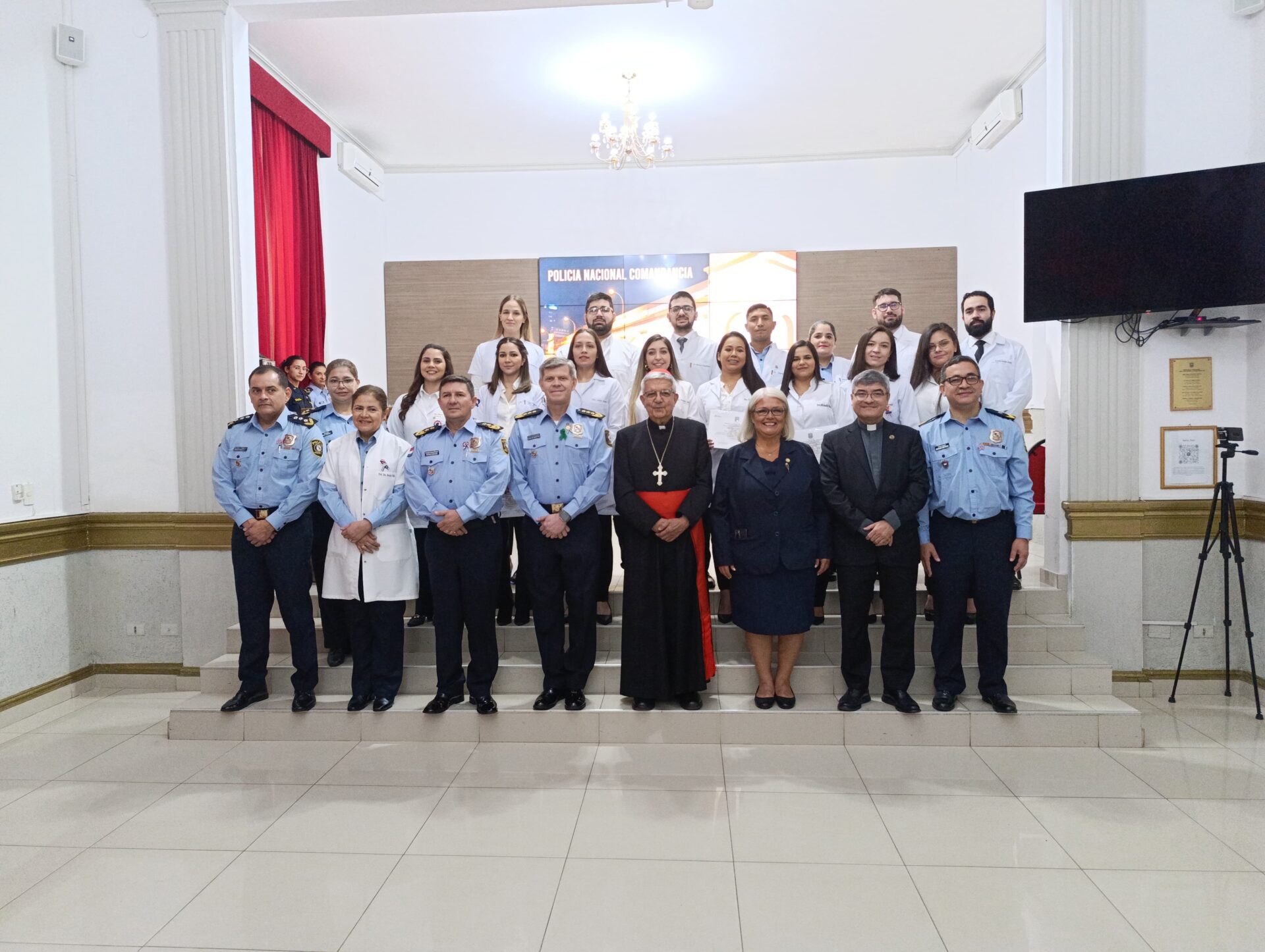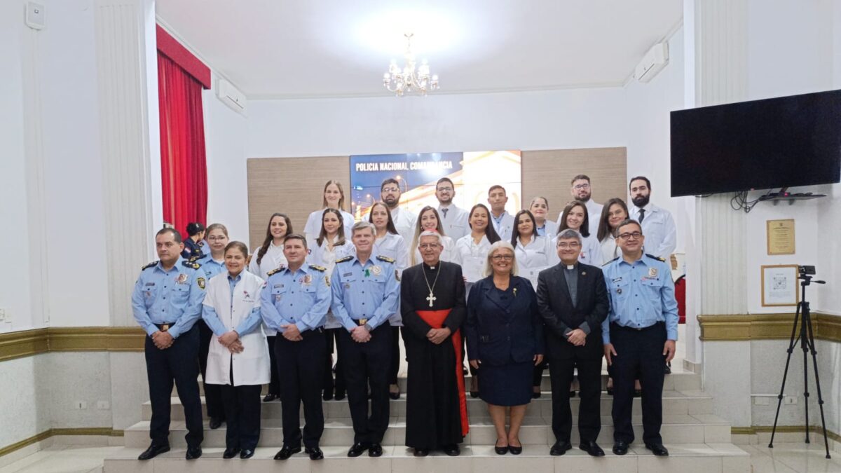 El solemne acto, que tuvo lugar en el salón de la Comandancia de la Policía Nacional “Crio. Pral. Rufino Acosta Gil”, contó con la destacada presencia del Cardenal Adalberto Martínez Flores, quien llevó a cabo la celebración de la palabra. Así también, estuvieron presentes autoridades universitarias, el Rector de la UC, Pbro. Dr. Narciso Velázquez Ferreira y la Decana de la Facultad de Ciencias de la Salud – Campus Asunción, Dra. María Magdalena Mayor, y el Comandante de la Policía Nacional, Crio. Gral. Cmdt. Carlos Benítez, quienes dirigieron palabras de ocasión a los nuevos médicos especialistas.