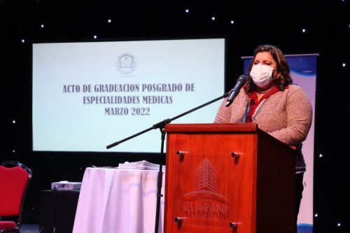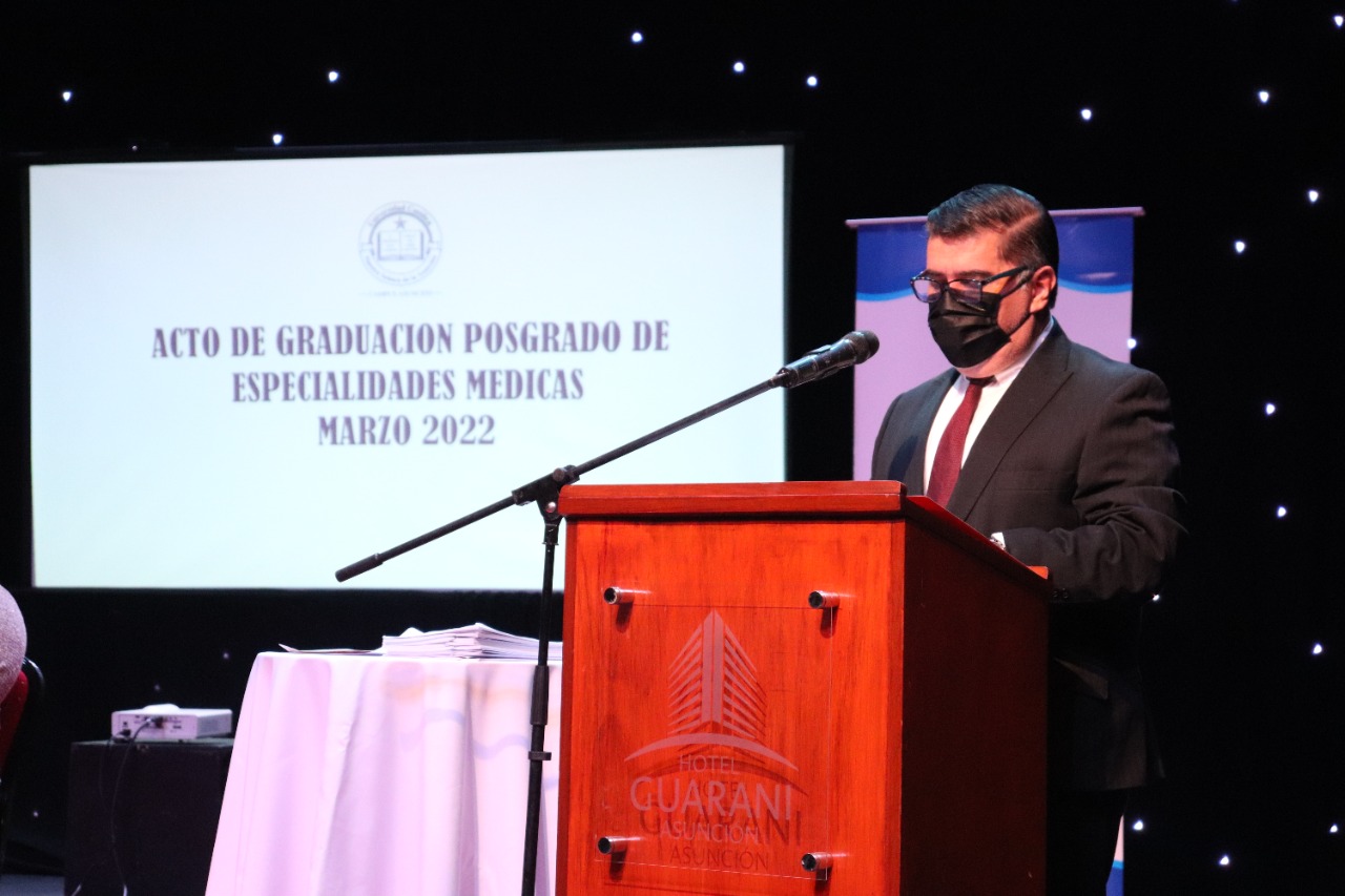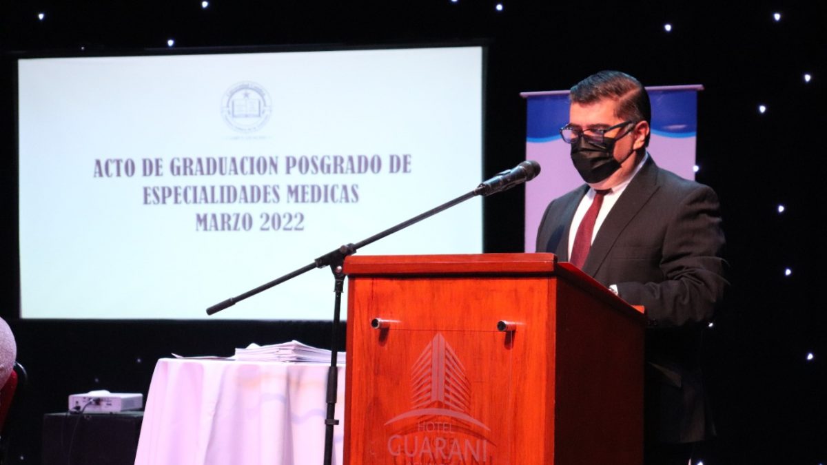 Durante la ceremonia de graduación de posgrado de las especialidades médicas de la Facultad de Ciencias de la Salud, el Dr. Julio Borba, ministro de Salud, se dirigió a los recientes graduados para expresar sus felicitaciones y palabras de aliento por el reciente logro alcanzado «el área de Ciencias Médicas de esta Universidad, ha elevado su prestigio y valoración en su sólida trayectoria universitaria, y se ve cristalizada hoy en cada uno de ustedes, en quienes depositamos nuestra esperanza de que serán de ahora en más, la mano tendida y dispuesta a edificar según cada una de sus acciones, la construcción de una salud al alcance de todos, e infundida de sólidos principios éticos, compromiso social, visión política del ser, y actitudes oportunas en pos de la prevención de afecciones que busquen agredir a nuestras comunidades».
