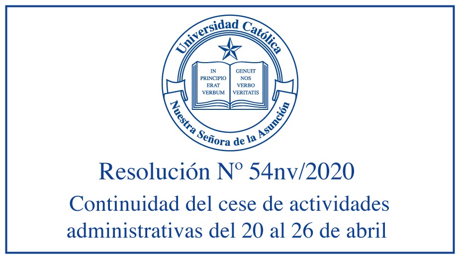 Artículo 1°. Disponer la continuidad del cese de las actividades administrativas de la Universidad Católica “Nuestra Señora de la Asunción”, desde el día 20 de abril hasta el 26 de abril de 2020, retomándose las mismas el día lunes 27 de abril de 2020.