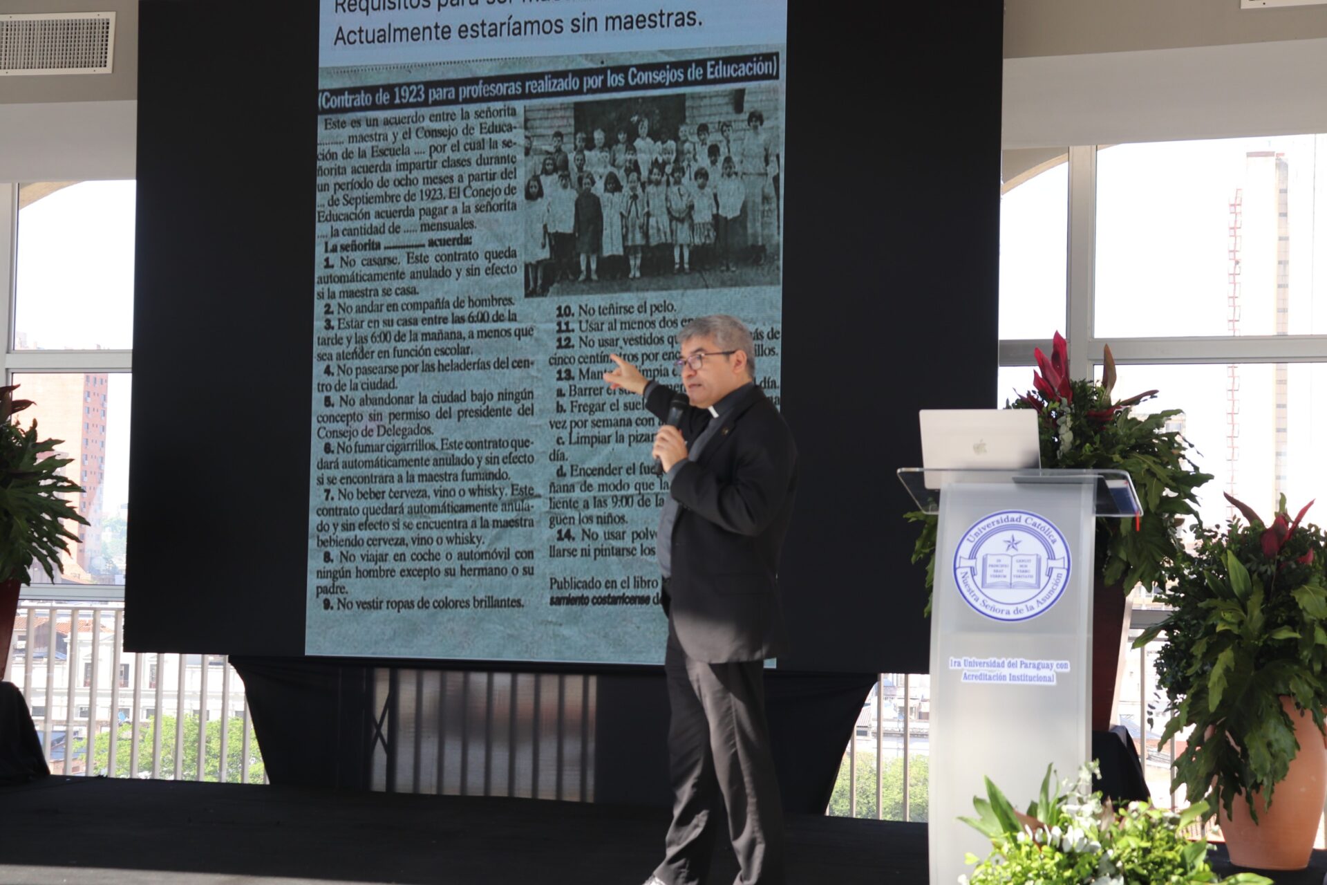 El evento comenzó con una oración inicial y las palabras de apertura a cargo de Monseñor Gabriel Escobar. La jornada continuó con una conferencia magustral del Rector Pbro. Dr. Narciso Velázquez Ferreira, quien disertó sobre la importancia y los retos de la pastoral educativa en el contexto actual. Luego, la Mg. Rossanna Benítez Ortiz, Vicerrectora Académica de la UC y el profesor Abog. Diego Doldán presentaron el manual «Modelo de Evaluación Experimental de Identidad y Calidad», detallando el mecanismo y proceso de evaluación.