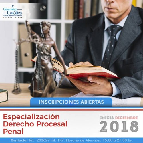 La especialización en Derecho Procesal Penal, aprobado por el Consejo Nacional de Educación Superior CONES por Res. Nº 573/2017, empezará el 14 de diciembre, en el Campus Universitario Itapúa.