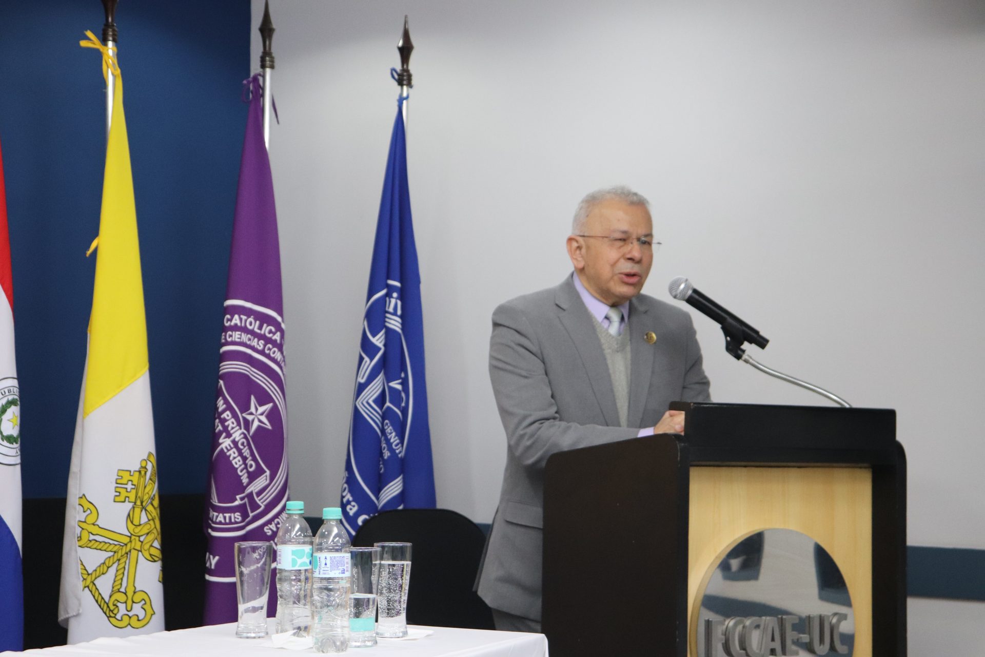 La primera jornada del congreso inició con las palabras de bienvenida del Decano de la FCCAE, Dr. Ángel Devaca Pavón, y la oración y bendición del Pbro. Osmar Fleitas, capellán de la Facultad.