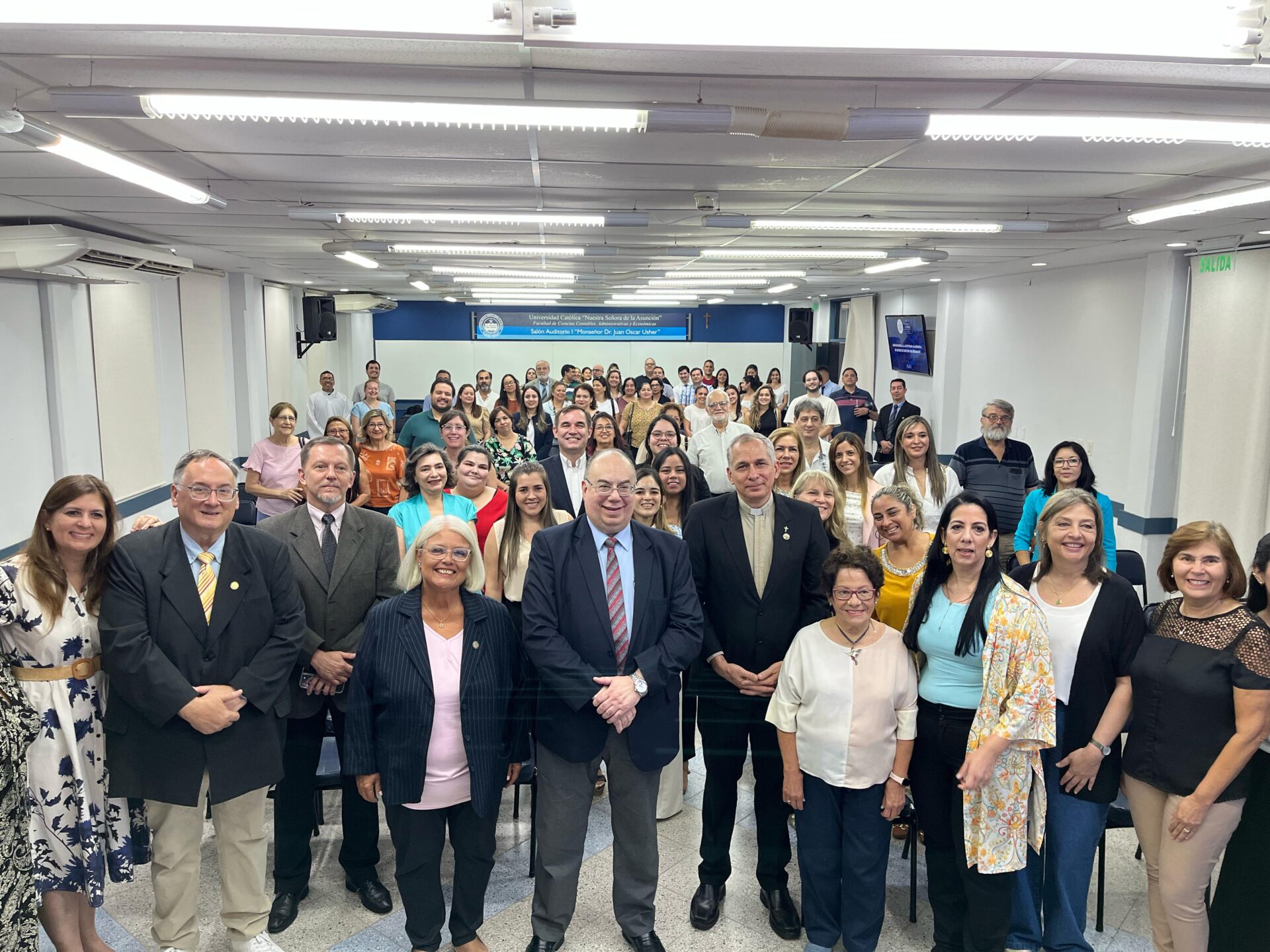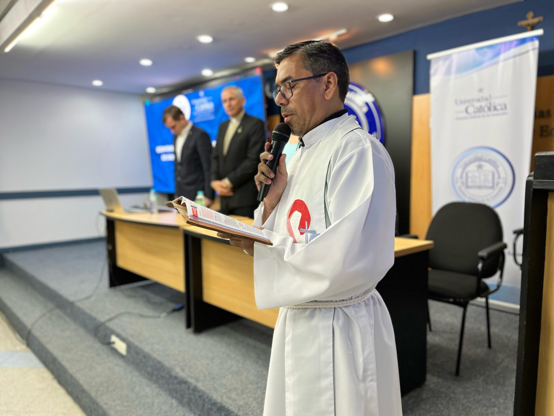 Luego de la bendición, a cargo del P. Miguel Ortigoza, el Pbro. Dr. Cristino Bonhert, Rector UC, invitó a los miembros de la FCS a la búsqueda conjunta de la verdad, trabajo en equipo y trabajo en redes. También estuvieron presentes la Vicerrectora Académica y de Investigación, Rossanna Benítez O., Vicerrector de Administración y Finanzas, Óscar López G. y la saliente decana de la FCS, Dra. María M. Mayor.