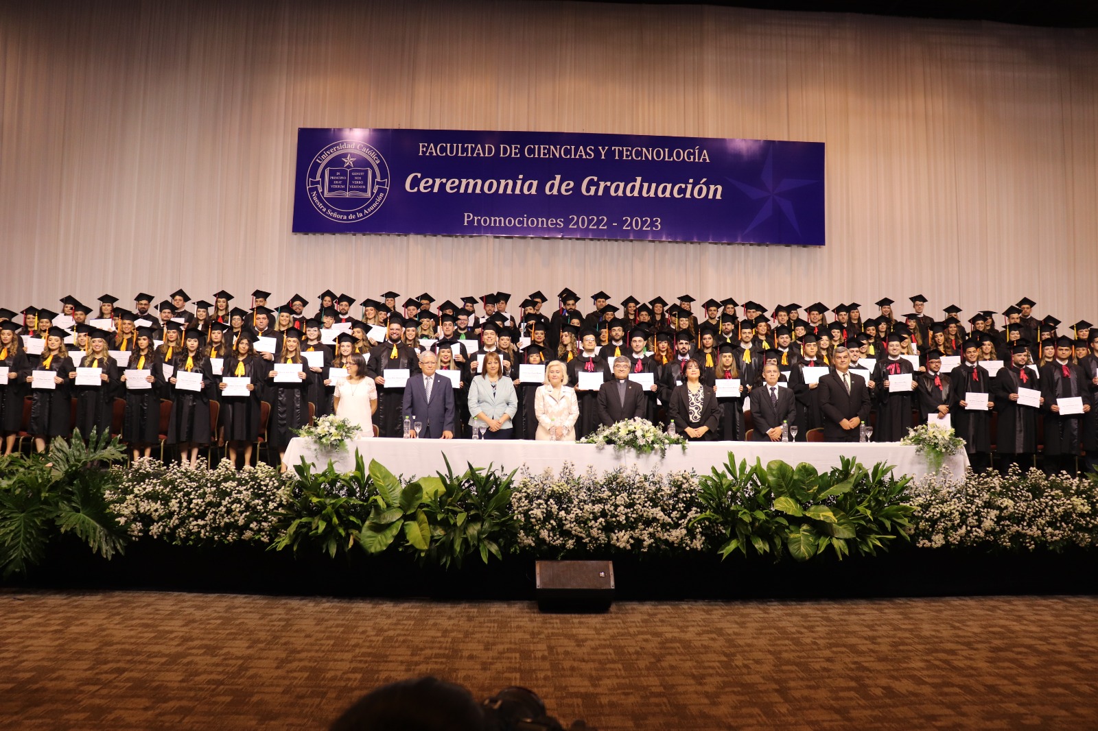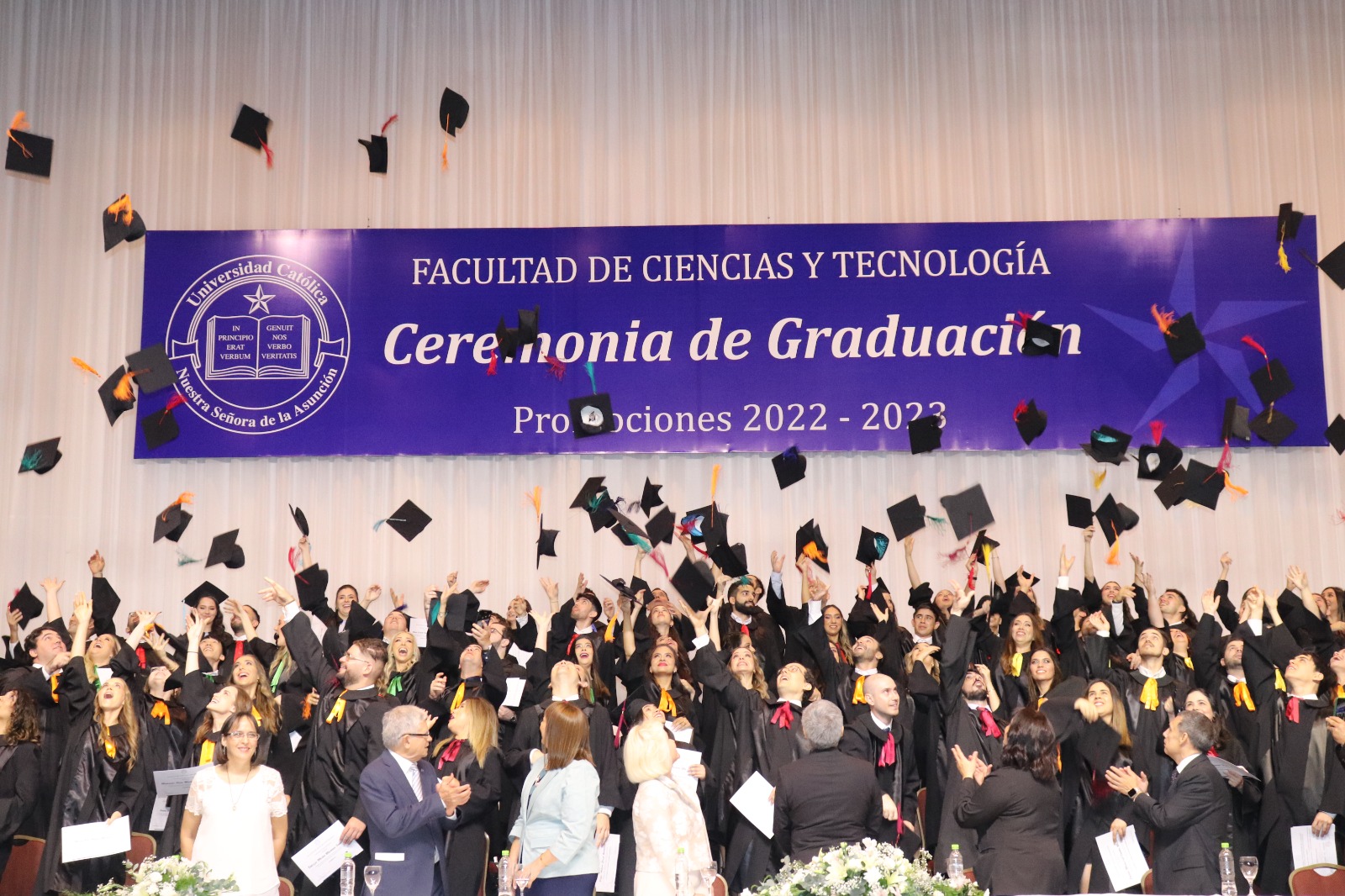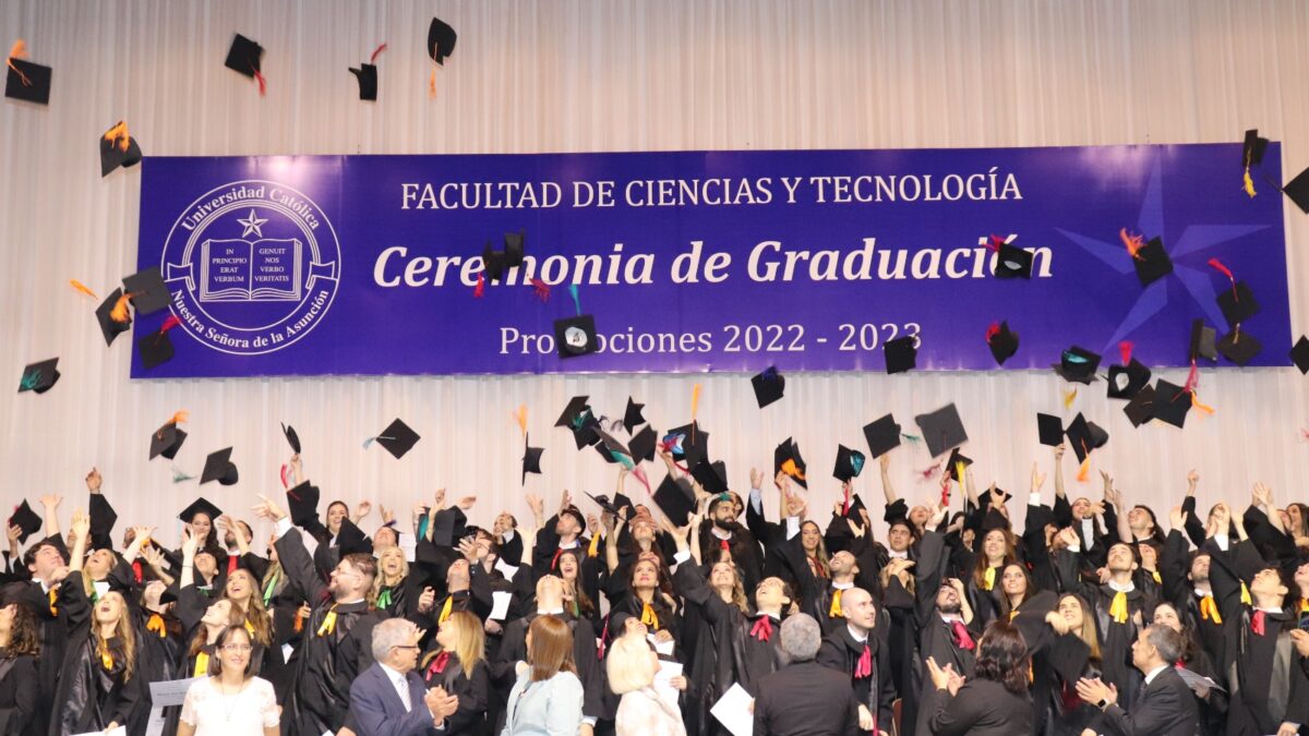 El acto de Graduación de las promociones 2022-2023 «Al instante se pusieron en camino a anunciar a Cristo», de las carreras de Análisis de Sistemas, Diseño Gráfico e Industrial, Arquitectura, Ingeniería Civil, Ambiental, Industrial, Informática y Electrónica de la Facultad de Ciencias y Tecnología- Campus Universitario Asunción, fue celebrado el sábado 11 de noviembre, en dos momentos, el primero por la mañana con la Misa de Acción de Gracias en la Catedral Metropolitana de Asunción y posteriormente en horas de la tarde la entrega de títulos y menciones honoríficas a alumnos destacados y sobresalientes.