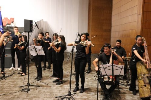 En la apertura del acto se entonó el Himno Nacional a cargo de la Orquesta de Instrumentos