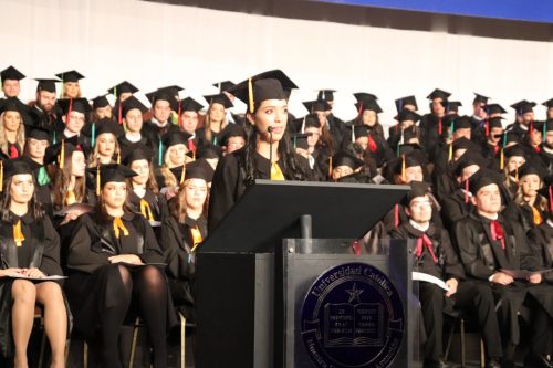 La mejor egresada de la promoción 2020, la Arq. Noelia Fleitas Acevedo, dirigió unas palabras de agradecimiento al auditorio «es un gran honor para mí estar frente a ustedes en representación de los egresados de la promoción 2020, en este momento es inevitable mirar unos años atrás y recordar todos esos momentos que dejaron una huella en nosotros y en nuestra formación profesional. Hoy al ver a mis compañeros me alegra ver lo mucho que crecimos, esta carrera me dio la oportunidad de rodearme de personas que de una u otra forma comparten mis pasiones y la búsqueda incalsable de mejorar lo que nos rodea».