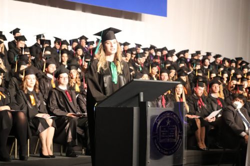 Como mejor egresada de la Promoción 2021 fue distinguida Astrid Spalding Coello, quien se dirigió a sus compañeros de promoción y los asistentes al acto resaltando que «en primer lugar me gustaría reconocer el esfuerzo realizado por nuestra prestigosa casa de estudios, institución que rápidamente fue adaptándose a las circunstancias de la pandemia, brindándonos una excelente formación a pesar de las dificultades presentadas en los últimos años, así mismo, quisiera resaltar el esfuerzo entregado por parte del alumnado, quienes hoy culminamos esta etapa como nuevos egresados, cursar las clases en línea, recibir correcciones y tutorías mediante esta nueva modalidad exigió algo nuevo de cada uno de nosotros, fue gracias a nuestra capacidad de adaptación que pudimos enfrentar nuevos desafíos y experiencias enriquecedoras».