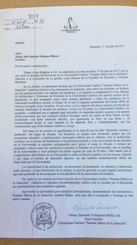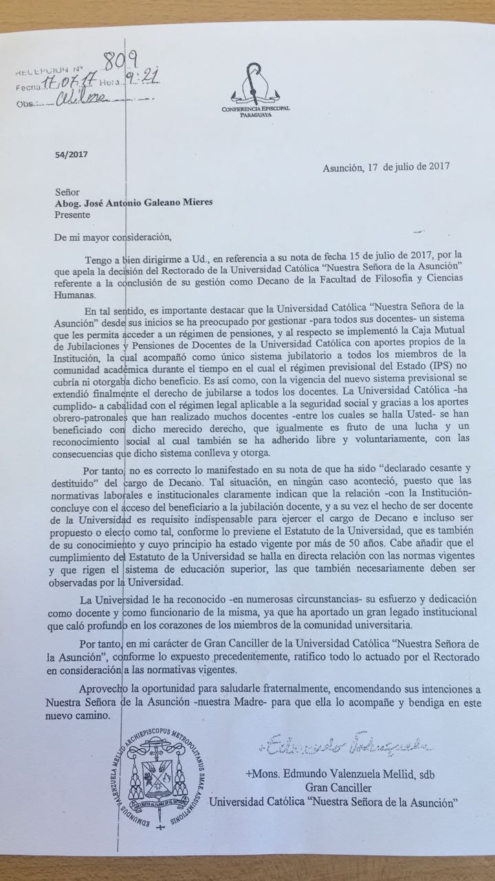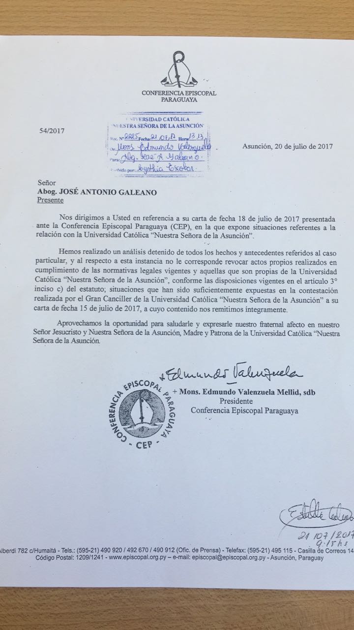 Mons. Edmundo Valenzuela, en su carácter de Gran Canciller de la Universidad Católica y Presidente de la Conferencia Episcopal Paraguaya responde, a través de sendas notas, al Abog. José Antonio Galeano.