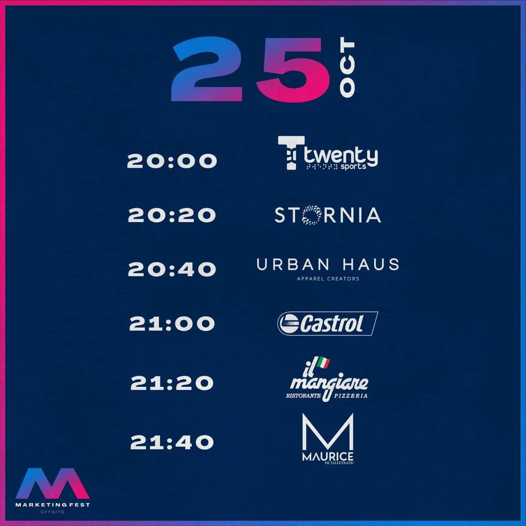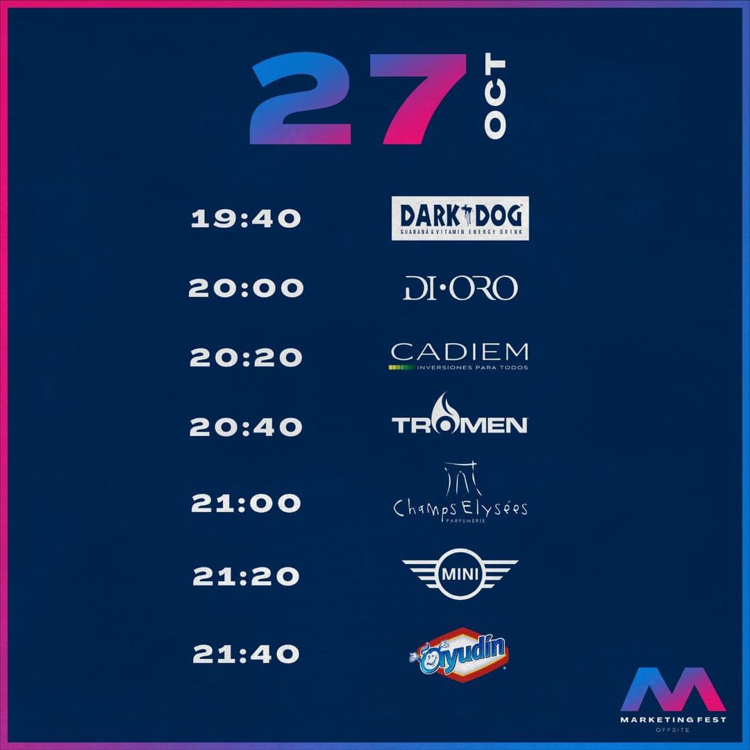 Estarán presentes 13 marcas que abarcan varios rubros de consumo masivo y otros más de nicho, entre los cuales se citan a Twenty Sports, STORNIA, Urban Haus, Castrol, Maurice, IL Mangiare, Dark Dog, Di Oro, CADIEM, TROMEN, CHAMPS, MINI y Ayudín, acompañarán en una noche de mucho entretenimiento y creatividad.