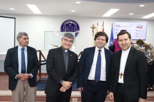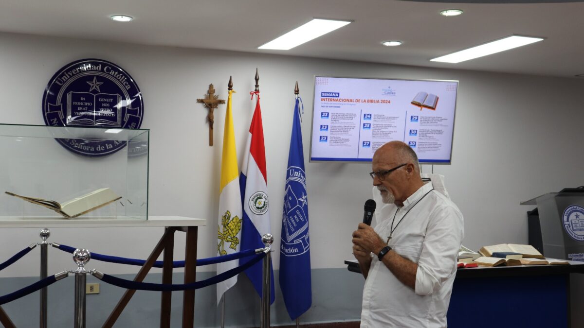 Ayer se celebró la inauguración de la Semana Internacional de la Biblia en el Aula Magna de la Universidad Católica «Nuestra Señora de la Asunción», con una solemne ceremonia de bendición a cargo del Padre Miguel Fritz, seguida de la apertura de una destacada exposición de Biblias. En el evento se presentó un valioso ejemplar de la Biblia de Gutenberg, una de las siete réplicas que existen en el mundo, donada por la Fondazione Scriptorium Foroiuliense a la Biblioteca Nacional del Paraguay, y que es, de hecho, la única réplica disponible en Sudamérica.