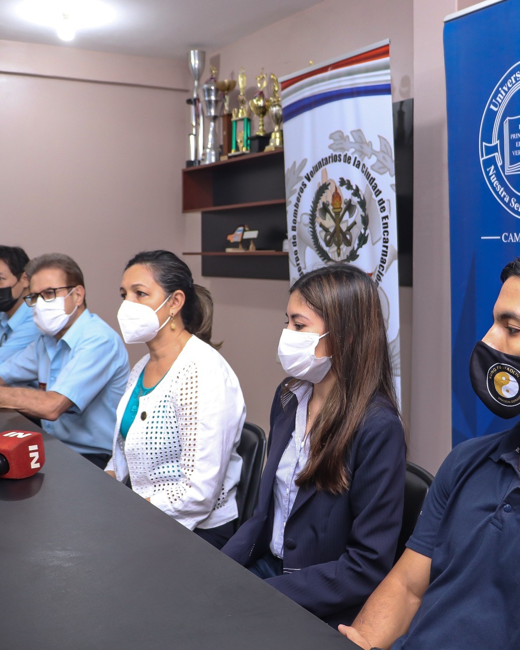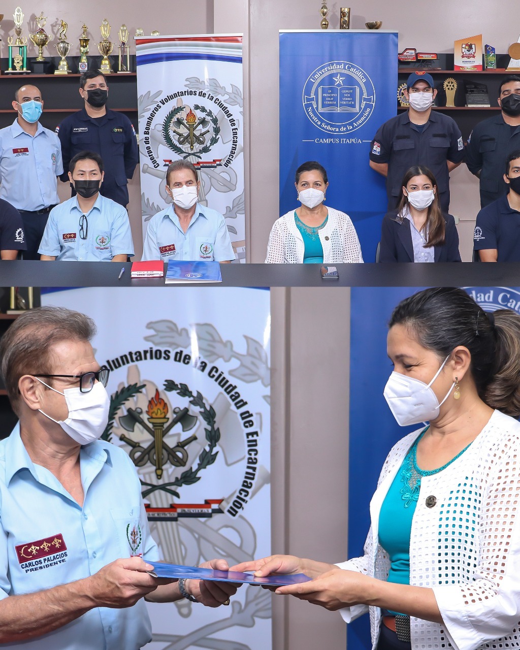 En el acto estuvieron presentes representantes de ambas instituciones; por la Universidad Católica Campus Itapúa, Mg. Patricia Peralta, encargada de despacho de la Facultad de Ciencias y Tecnología, Ing. Inf. Aura Villalba, directora de la carrera de Ingeniería Informática y los estudiantes. Por el Cuerpo de Bomberos Voluntarios de Encarnación, su presidente el Brigadier General Carlos Palacios, Brigadier Emmanuel Son Lee, Tesorero, y Brigadier Luis Cabral, Vocal de dicho Cuartel General.