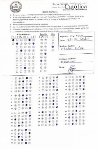 La siguiente Hoja de Respuestas corresponde al estudiante Héctor Báez con C.I.N° 0.000.001 que