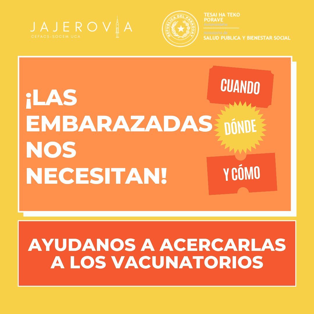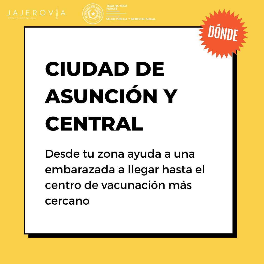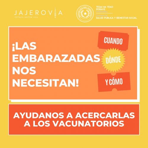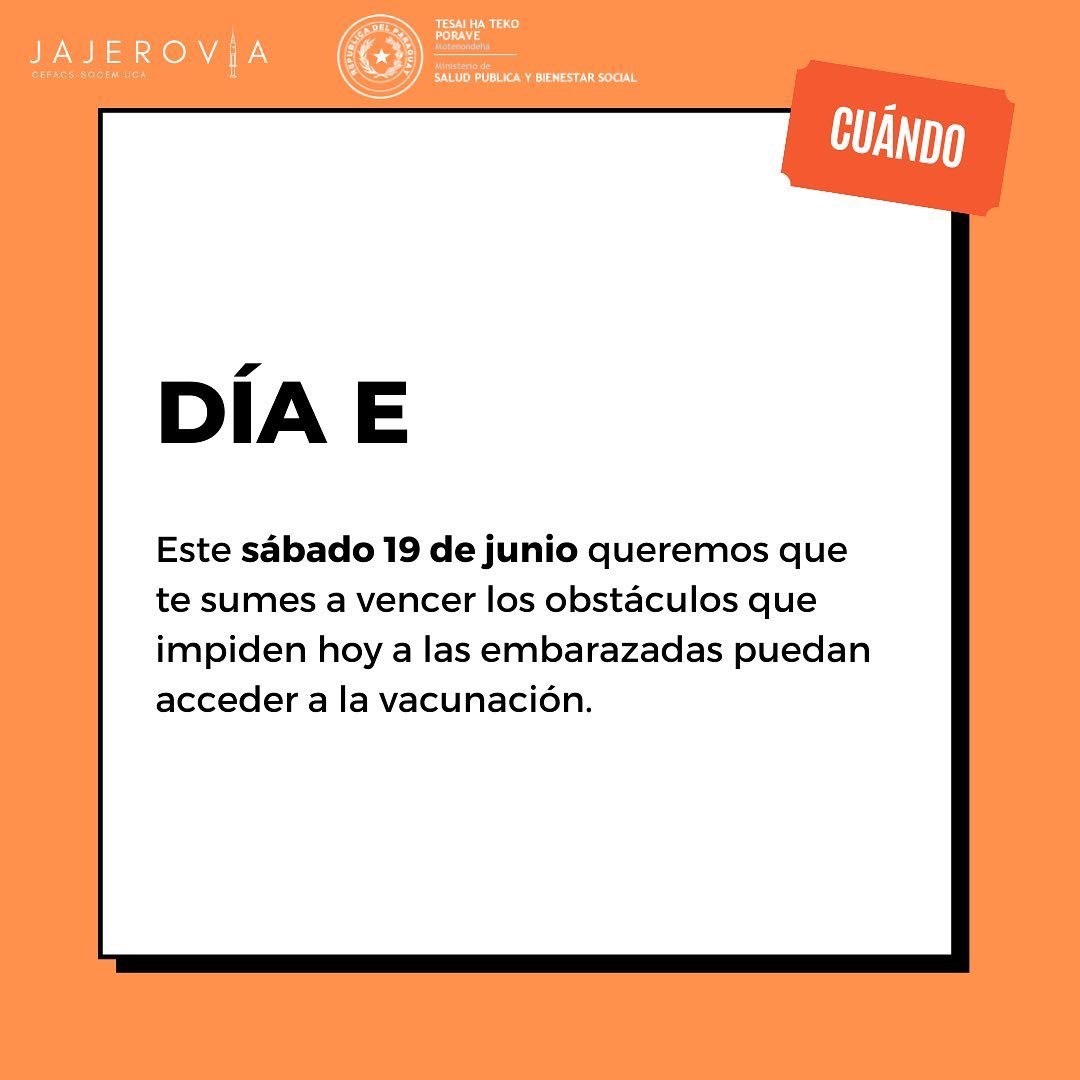 Por parte del MSPyBS, la vocera en comunicar sobre esta alianza interinstitucional en el Traslado al vacunatorio de las embarazadas que lo requieran, fue la Viceministra de Rectoría y Vigilancia de la Salud, Lida Sosa. La misma comunicó que el denominado “Día E” de inmunización será este sábado 19 de junio desde las 7 hasta las 17hs, y que el Complejo SND será el único vacunatorio anticovid habilitado en capital, para las embarazadas que cuenten con al menos 20 semanas de gestación.