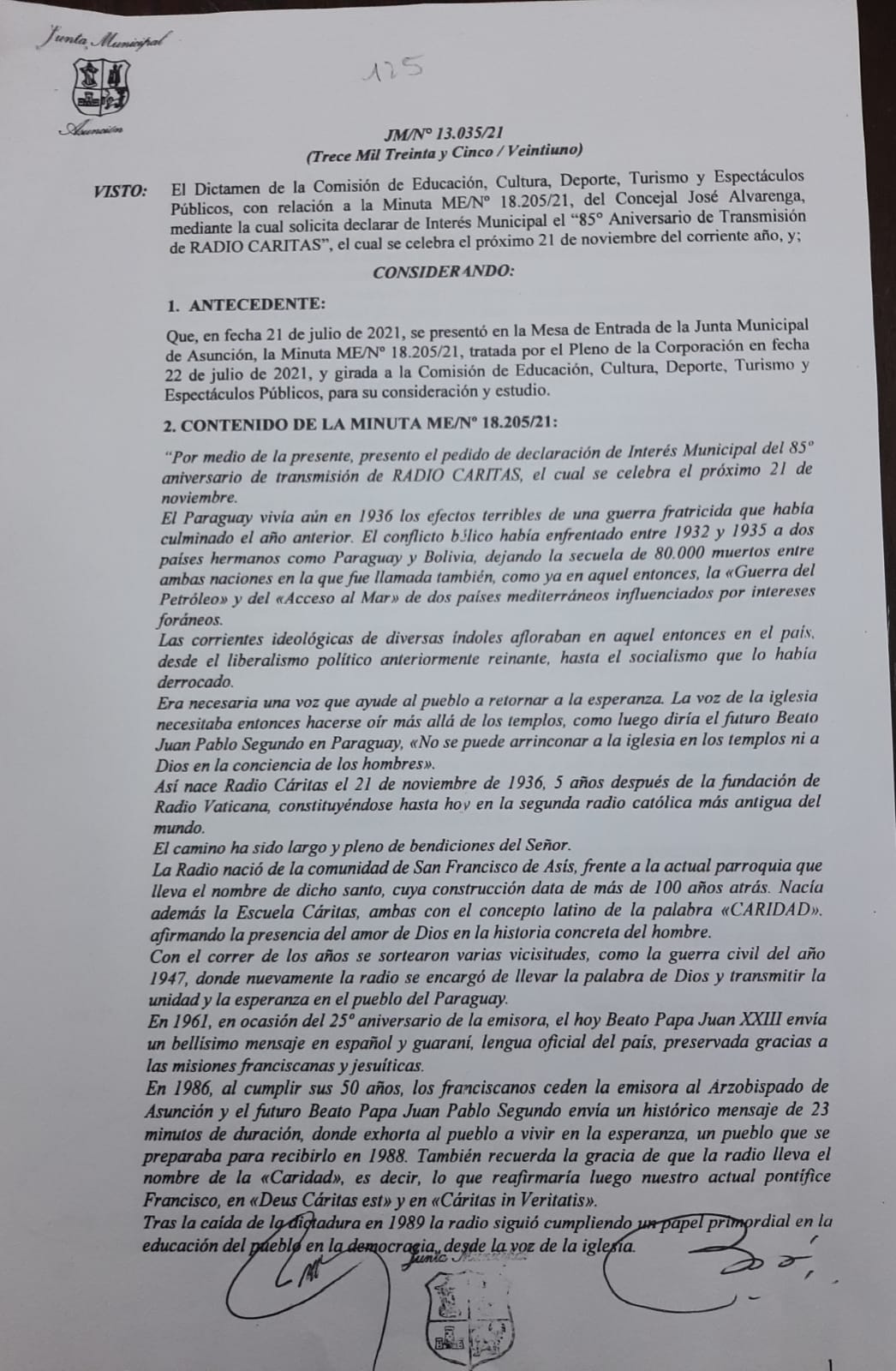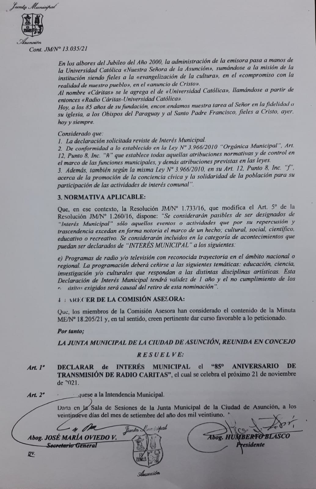 Por Resolución N° 13.035/21 es declarado de Interés Municipal el 85° Aniversario de Radio Cáritas Universidad Católica, que se celebra el 21 de noviembre de 2021, en reconocimiento a su larga trayectoria en el ámbito nacional promoviendo la cultura, el deporte, la formación académica y espiritual de la sociedad paraguaya.