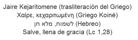 En este punto podemos hacer un mejor análisis si vamos al idioma en que originalmente estaba escrito el Evangelio de Lucas, es decir el griego, en este texto en lugar de llamar a la Virgen la llena de gracia, el ángel la saluda usando el vocablo kejaritomene, vocablo que no tiene traducción al latín y mucho menos al español, ya que más que una palabra es un concepto que indica que la persona a quien va dirigida es «desde siempre, por siempre, y hasta siempre, llena de gracia», es decir, esta sola palabra en griego nos revela que la Virgen fue concebida sin pecado, no por méritos de ella, claro está, pero si por gracia de Dios.